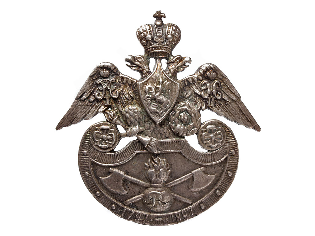 Копия знака Гренадерского саперного Его Императорского Высочества Великого Князя Петра Николаевича батальона, изготовленная специально для военно-исторической реконструкции. Знак выполнен из посеребренной латуни, на винте.