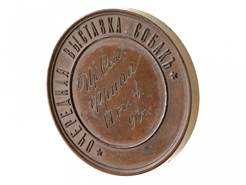 Бронзовая медаль Общества любителей породистых собак. Была вручена на очередной выставке собак в 1893 году ирландскому сеттеру Фрине. Очень хорошее состояние, красивая патина.