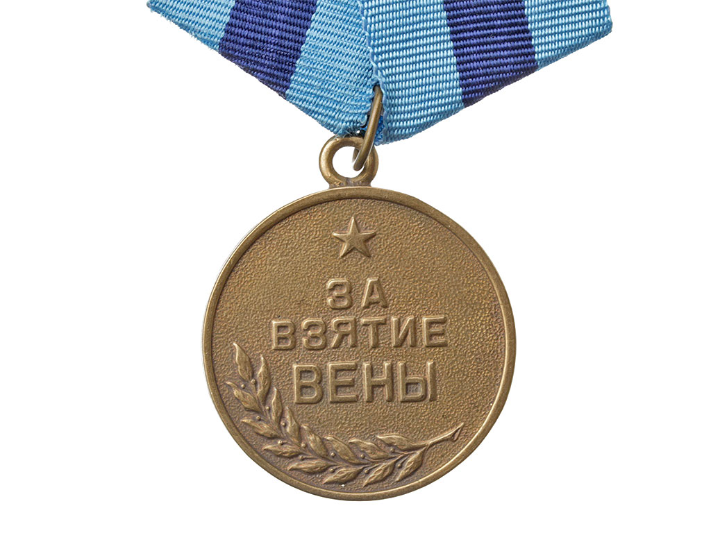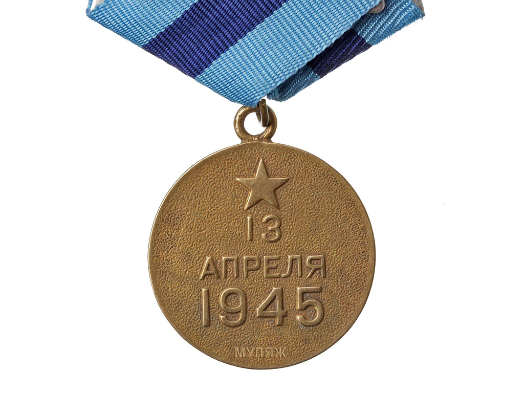 На оборотной стороне медали дата взятия Вены: “13 апреля 1945”, над датой пятиконечная звездочка.