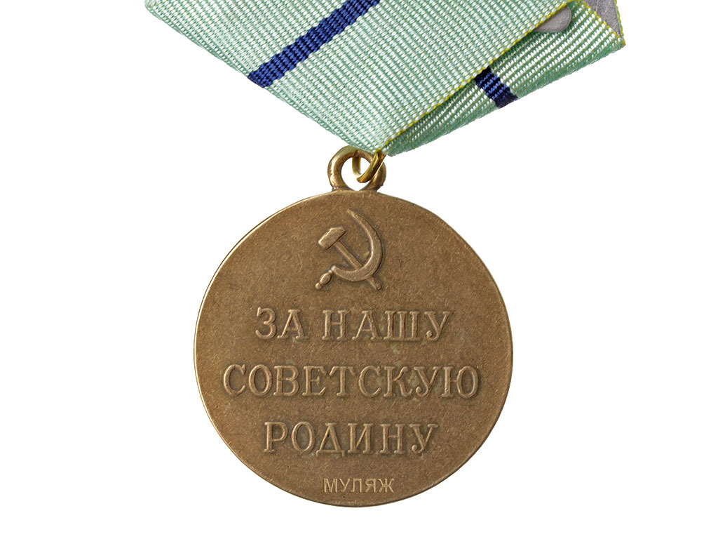 На оборотной стороне медали надпись в три строки “ЗА НАШУ СОВЕТСКУЮ РОДИНУ”. Над надписью, в верхней части медали, изображение серпа и молота.