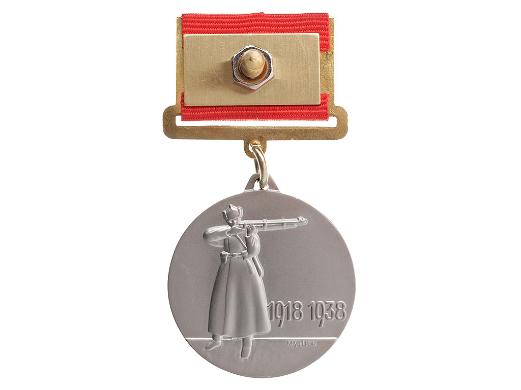 На оборотной стороне медали изображена фигура стреляющего из винтовки красноармейца, одетого в зимнюю караульную форму, внизу правее фигуры красноармейца дата “1918 - 1938”.