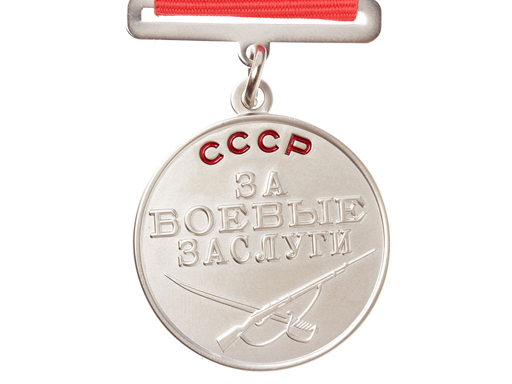 Высокого качества копия медали "За боевые заслуги". Данный вариант медали (на квадратной колодке) вручался с момента учреждения до осени 1943 года, когда ему на смену пришел вариант на пятиугольной колодке.