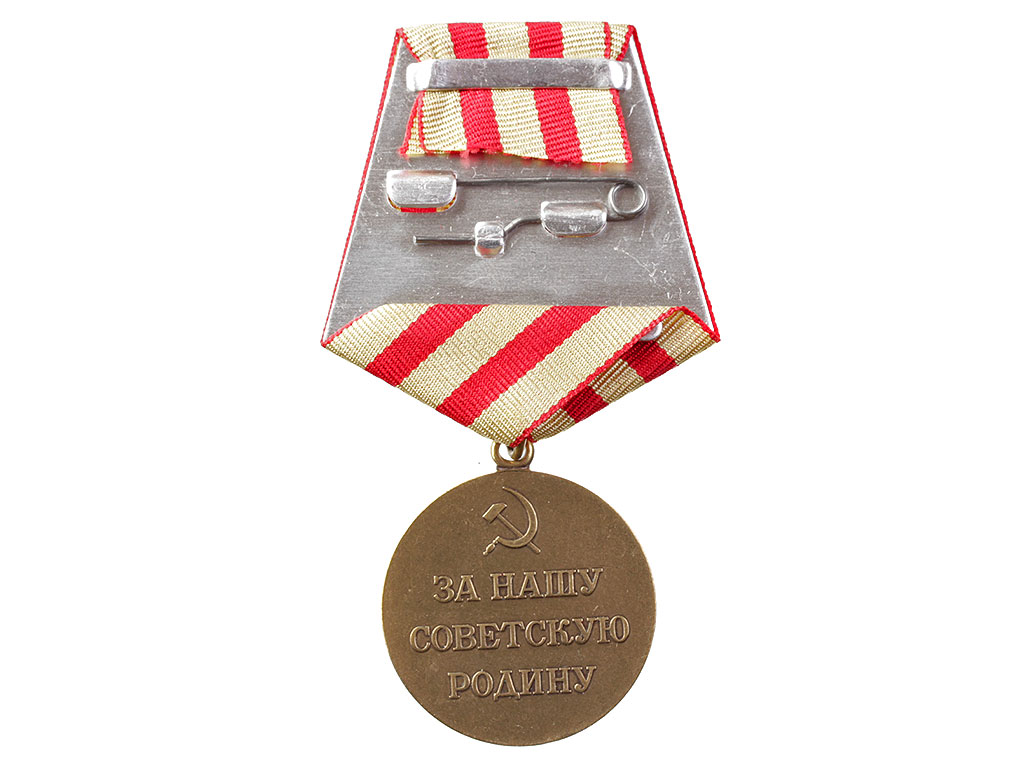 Медаль при помощи ушка и кольца соединяется с пятиугольной колодочкой, обтянутой шелковой муаровой лентой шириной 24 мм. На ленте три продольные оливковые полоски шириной 5 мм каждая и две красные полоски шириной 4 мм каждая. Края ленты окантованы узенькими красными полосками.