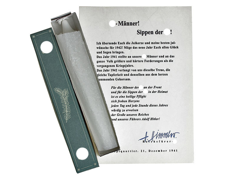 Копия отличного качества исключительно редкого предмета, известного всем интересующимся историей Третьего рейха и Альгемайне-СС (Allgemeine SS): йольской свечи. На сегодняшний день известно около десятка сохранившихся оригинальных экземпляров. Свеча помещена в картонную коробку, украшенную изображениями еловых лапок и рун SS. На бумаге достоверно воспроизведен текст сопроводительного письма с факсимиле подписи Гиммлера: