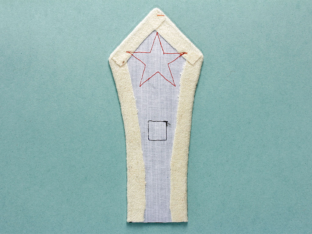 Размер клапана: длина в готовом виде (не считая запаса на подгиб) - 18 см, ширина внизу - 5 см, по середины длины - 6 см, расстояние между вершинами углов в широкой части - 8,5 см, расстояние линии, соединяющей вершины углов в широкой части от вершины клапана - 4,5 см.