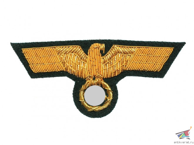 Вышитый золотой металлизированной нитью на темно-зеленой суконной подложке нагрудный орел на китель генерала Вермахта и береговой артиллерии Кригсмарине.