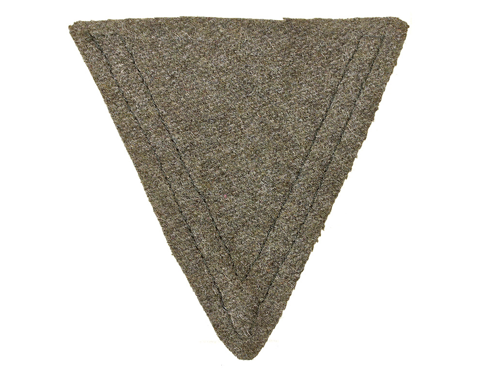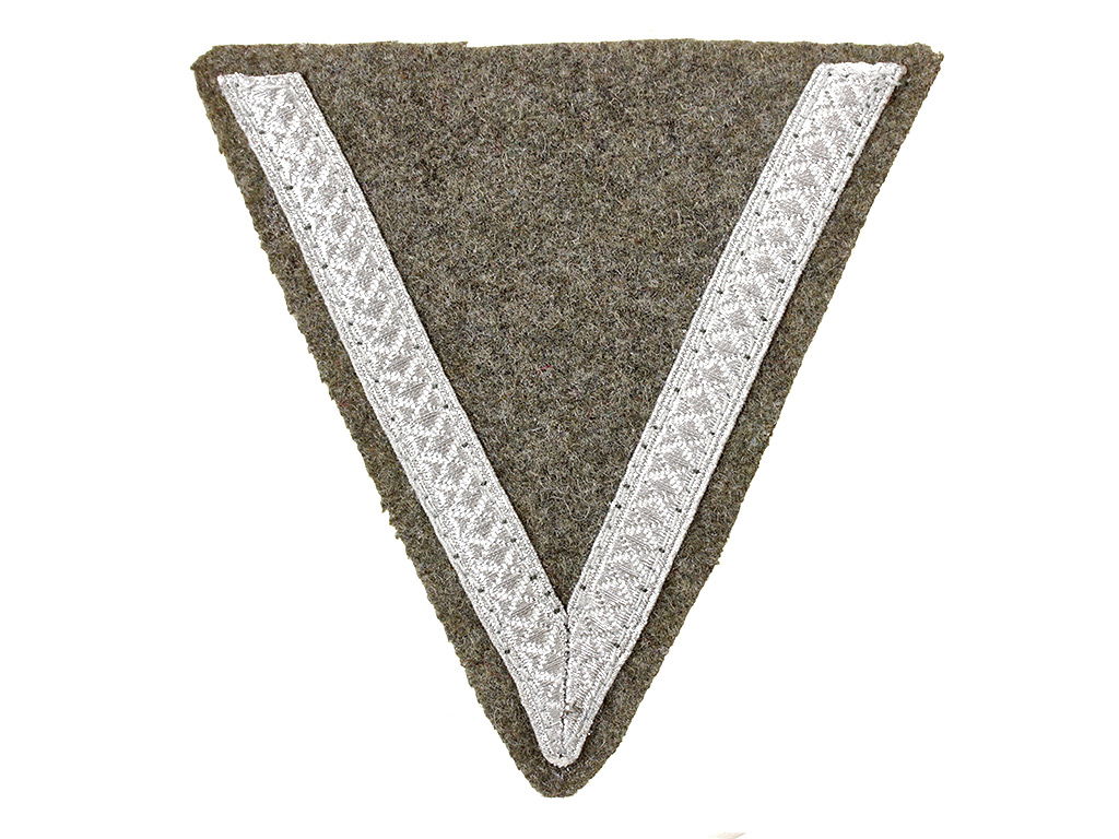Шеврон Ефрейтора или Гефрайтер Вермахта - Треугольный клапан. Крепится на левом рукаве выше локтя. Один ряд серебристого алюминиевого 9 мм галуна. Цвет клапана фельдграу.