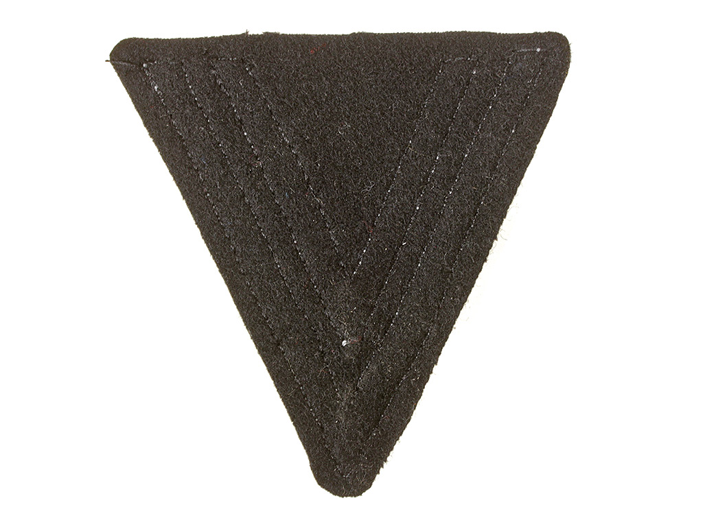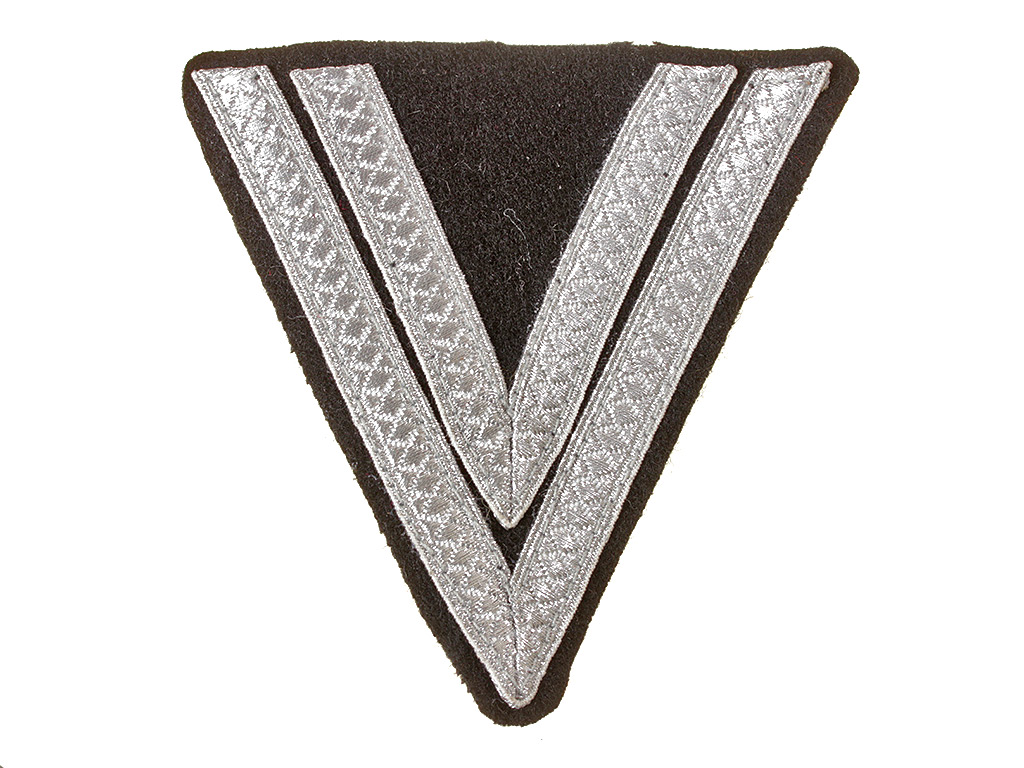 Шеврон СС Роттенфюрер (SS-Rottenfuehre) - Треугольный клапан. Крепится на левом рукаве выше локтя под орлом. Два ряда серебристого алюминиевого 9 мм галуна. Цвет клапана черный.