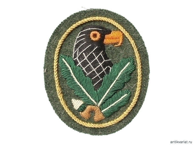 Нарукавная нашивка немецкого снайпера изготавливалась из стандартного армейского сукна цвета фельдграу (серый). Имела овальную форму размером 70 мм повысоте и 55 мм по ширине. На ней машинным или ручным способом вышивалась чёрная голова орла с жёлтым клювом, с тремя зелеными дубовыми листьями и желудем.