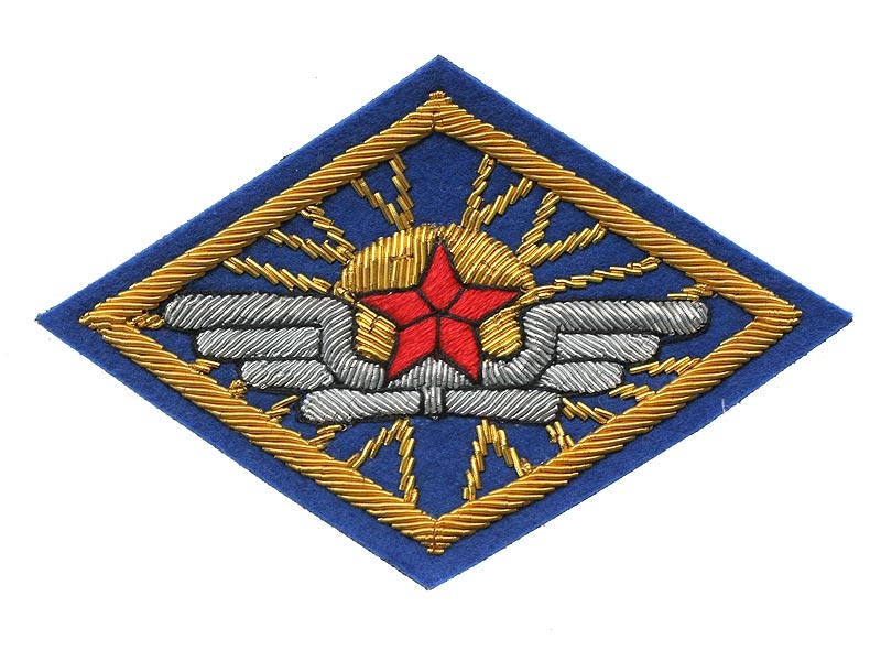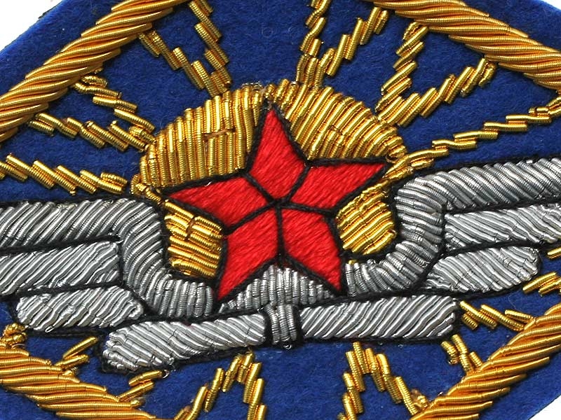 Голубое поле, золотое шитье, крылья и пропеллер самолета вышиты белой металлизированной нитью (серебром).