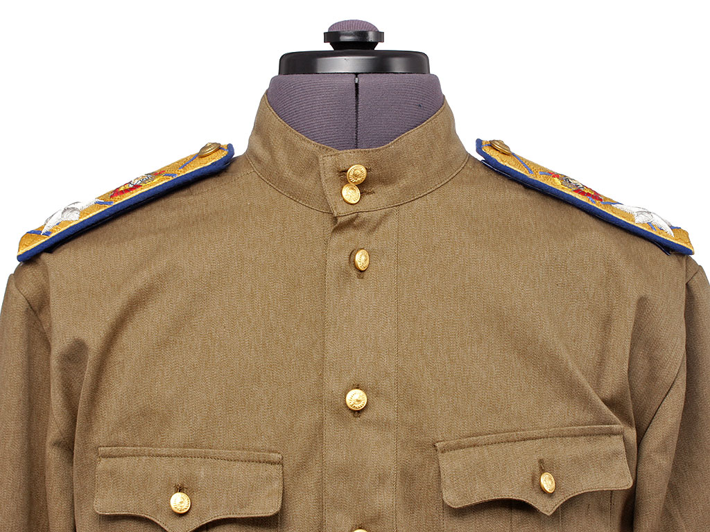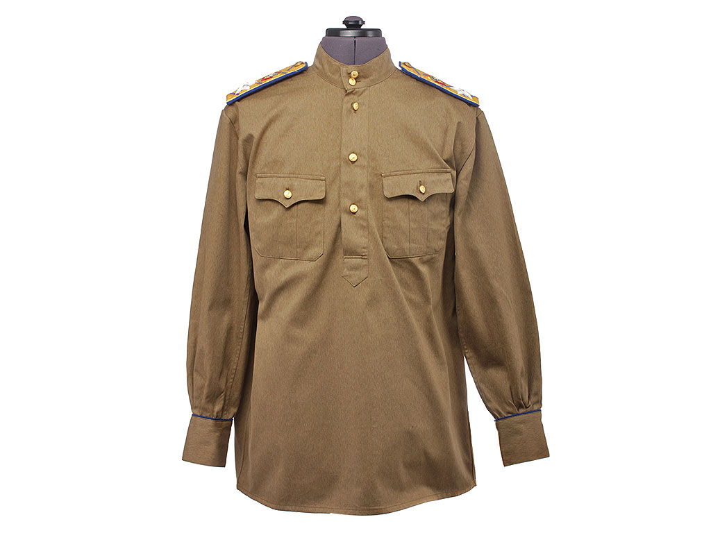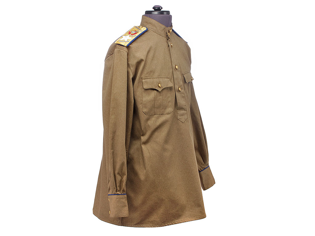 Гимнастерка с мягким стоячим воротником, застегивающимся на две форменные генеральские пуговицы с изображением Государственного герба СССР (генеральские - только у высшего начсостава) малого размера. Передний разрез гимнастерки прикрыт планкой и имеет открытую застежку на трех малых форменных пуговицах. На груди два накладных кармана с трехмысковыми клапанами и бантовой складкой, с застёжкой на одну малую форменную пуговицу.