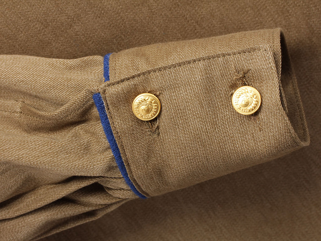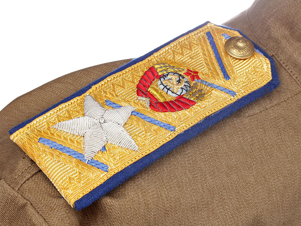 Золотое металлизированное поле с васильковым кантом и зигзагообразным просветом, с большой шитой серебряной звездой и гербом СССР. Пуговицы погонные латунные, с изображением Государственного герба СССР.