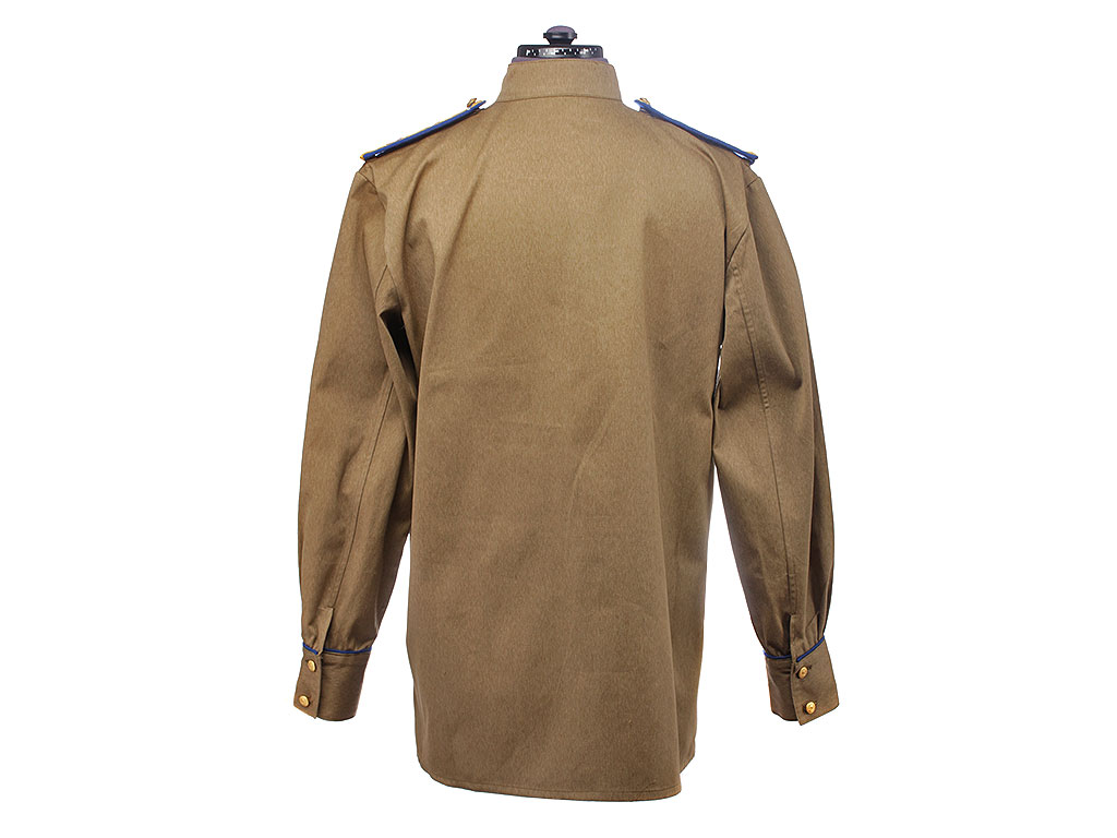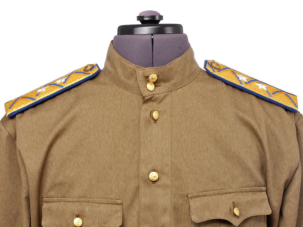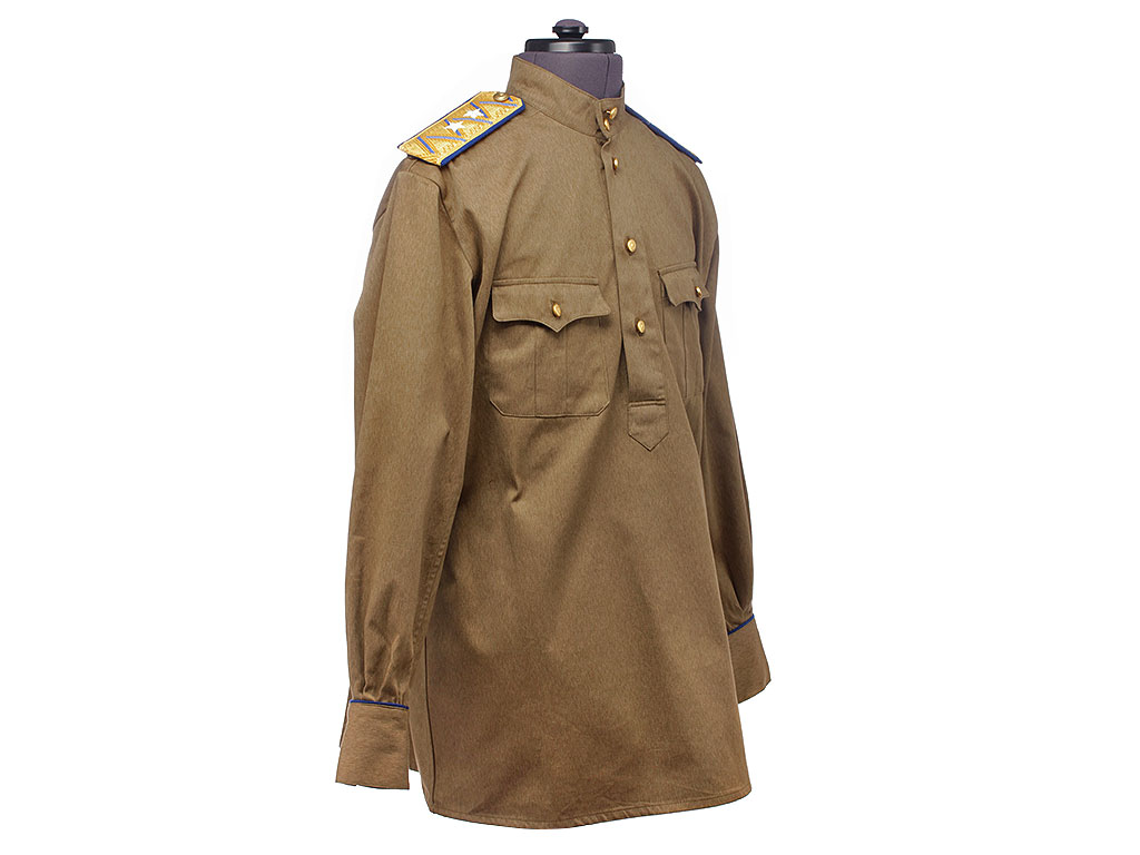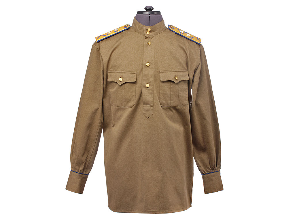 Гимнастерка с мягким стоячим воротником, застегивающимся на две форменные генеральские пуговицы с изображением Государственного герба СССР (генеральские - только у высшего начсостава) малого размера. Передний разрез гимнастерки прикрыт планкой и имеет открытую застежку на трех малых форменных пуговицах. На груди два накладных кармана с трехмысковыми клапанами и бантовой складкой, с застёжкой на одну малую форменную пуговицу.