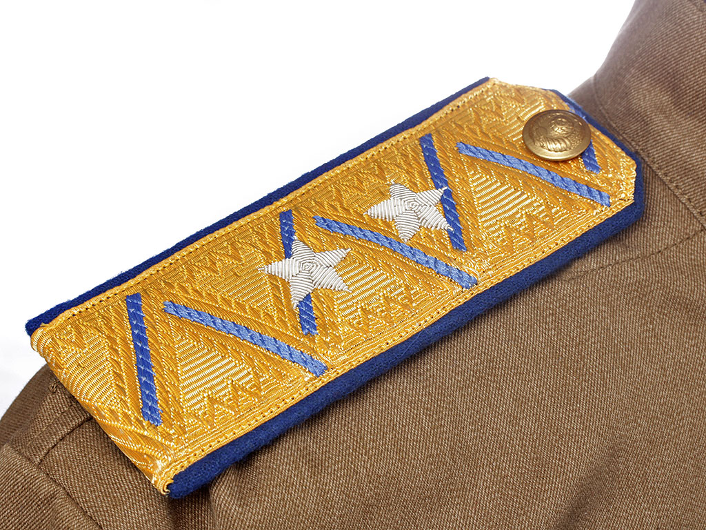 Пара повседневных погон комиссара Государственной Безопасности (ГБ) 3-го ранга. Золотое металлизированное поле с голубым кантом и зигзагообразным просветом, с двумя шитыми серебряными звездами. Пуговицы погонные латунные, с изображением Государственного герба СССР.