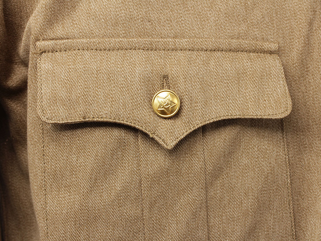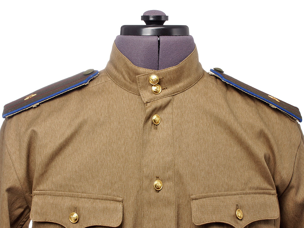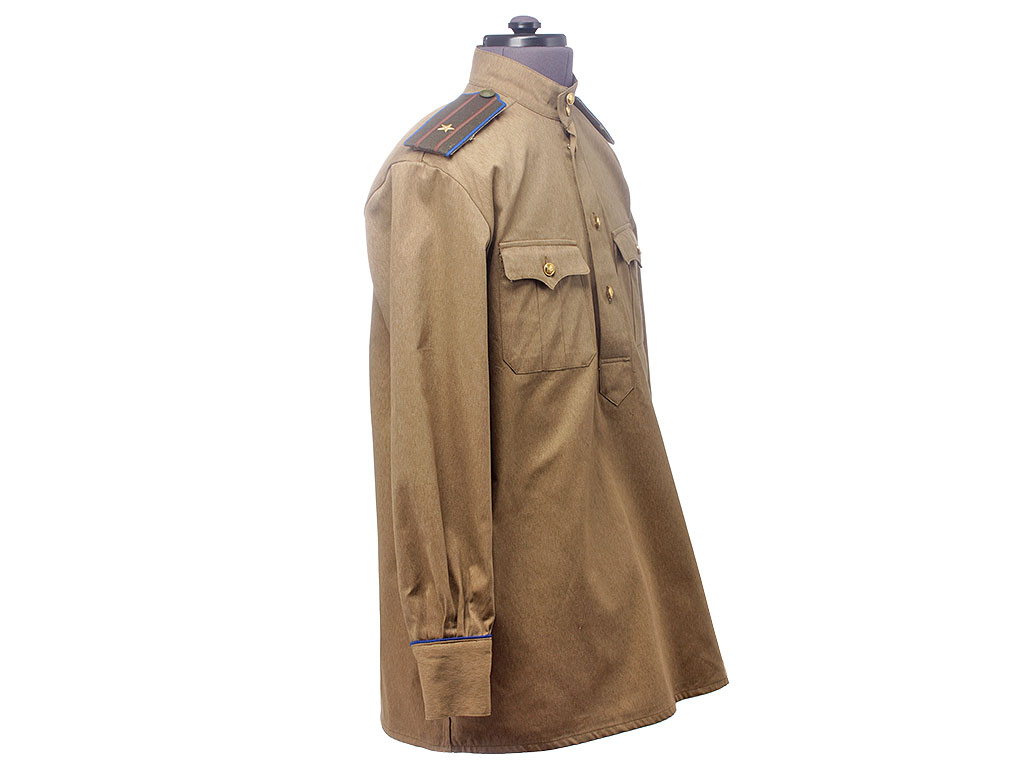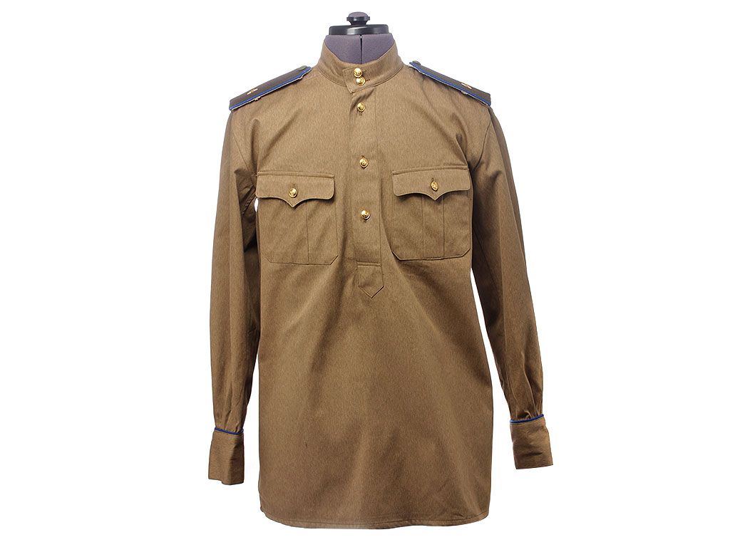 Гимнастерка с мягким стоячим воротником, застегивающимся на две форменные пуговицы малого размера. Передний разрез гимнастерки прикрыт планкой и имеет открытую застежку на трех малых форменных пуговицах. На груди два накладных кармана с трехмысковыми клапанами и бантовой складкой, с застёжкой на одну малую форменную пуговицу.