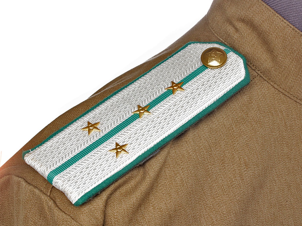 Повседневные погоны шестиугольной формы, белое металлизированное поле, зеленый просвет и кант.