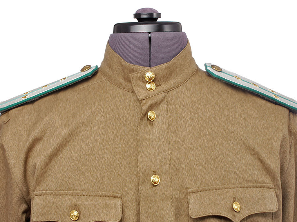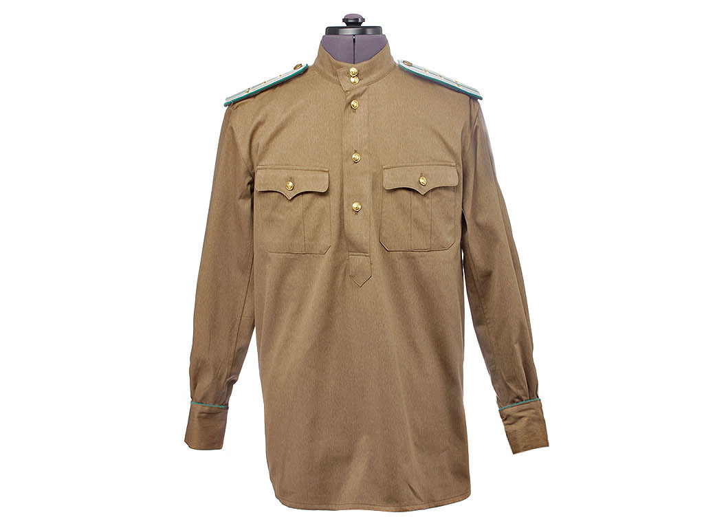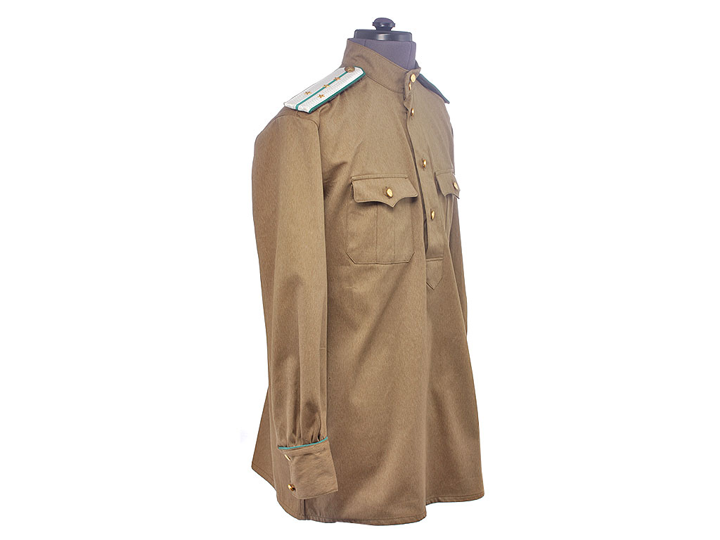 Гимнастерка с мягким стоячим воротником, застегивающимся на две форменные пуговицы малого размера. Передний разрез гимнастерки прикрыт планкой и имеет открытую застежку на трех малых форменных пуговицах. На груди два накладных кармана с трехмысковыми клапанами и бантовой складкой, с застёжкой на одну малую форменную пуговицу.
