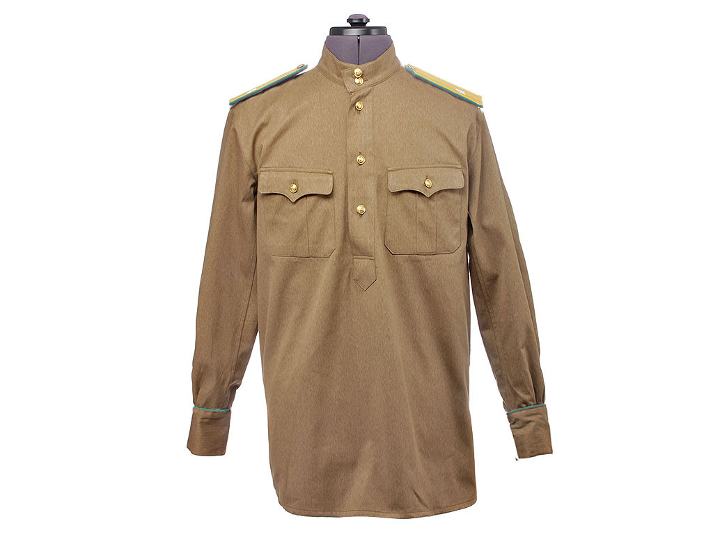 Гимнастерка с мягким стоячим воротником, застегивающимся на две форменные пуговицы малого размера. Передний разрез гимнастерки прикрыт планкой и имеет открытую застежку на трех малых форменных пуговицах. На груди два накладных кармана с трехмысковыми клапанами и бантовой складкой, с застёжкой на одну малую форменную пуговицу.