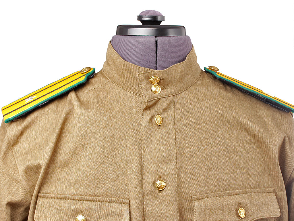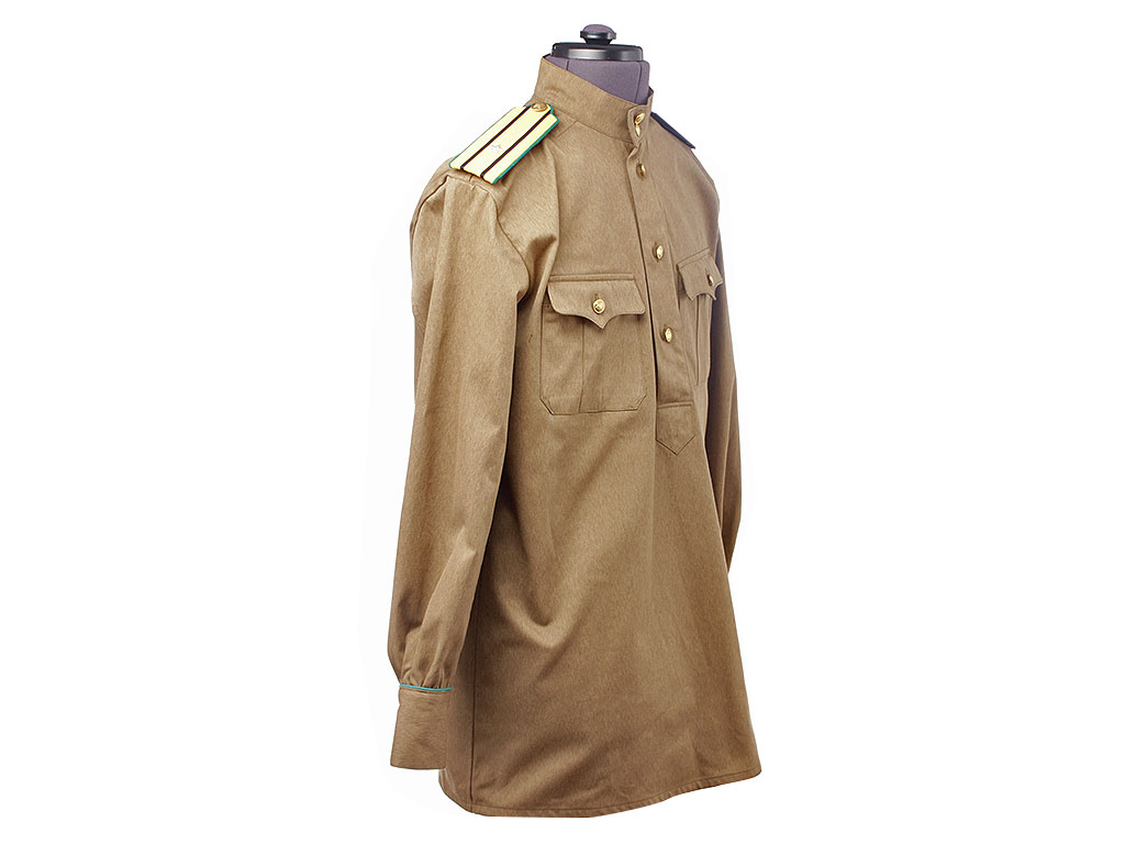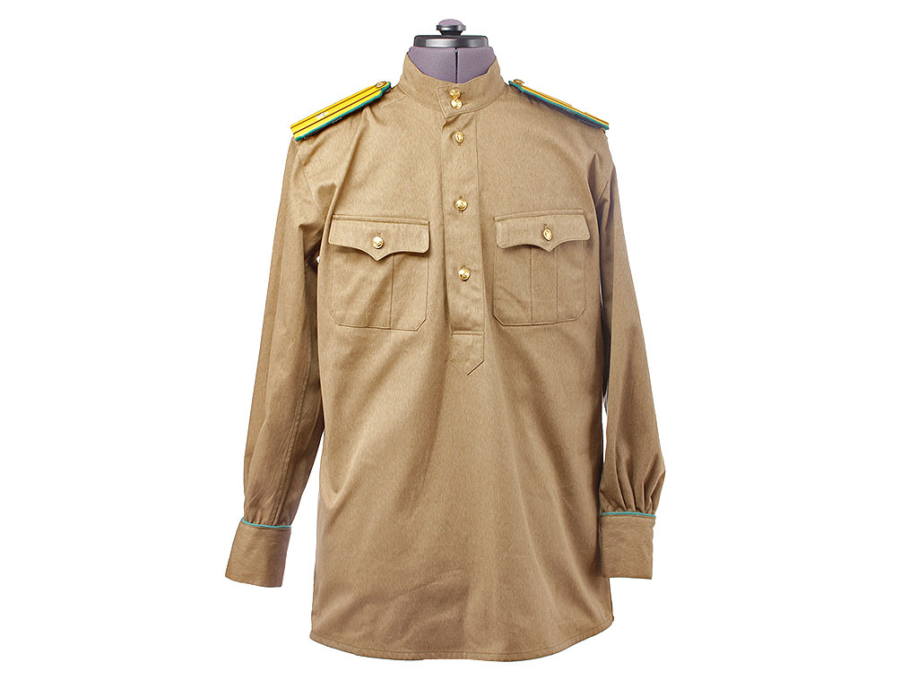 Гимнастерка с мягким стоячим воротником, застегивающимся на две форменные пуговицы малого размера. Передний разрез гимнастерки прикрыт планкой и имеет открытую застежку на трех малых форменных пуговицах. На груди два накладных кармана с трехмысковыми клапанами и бантовой складкой, с застёжкой на одну малую форменную пуговицу.