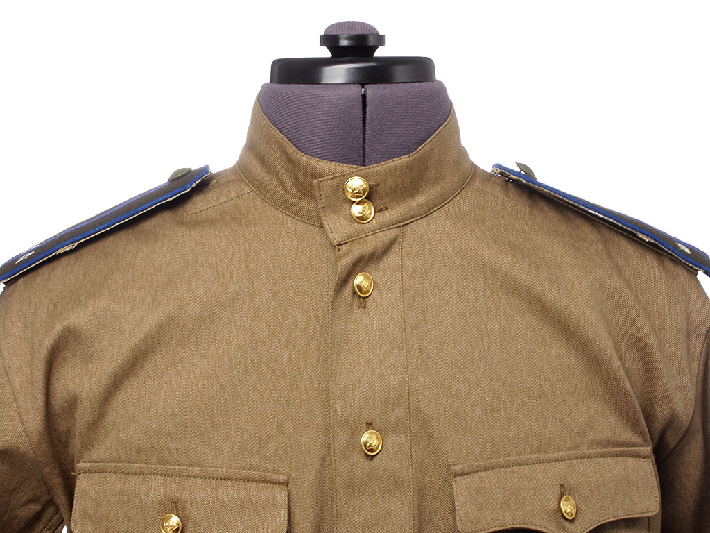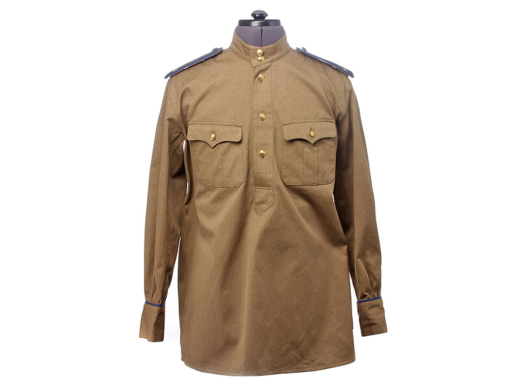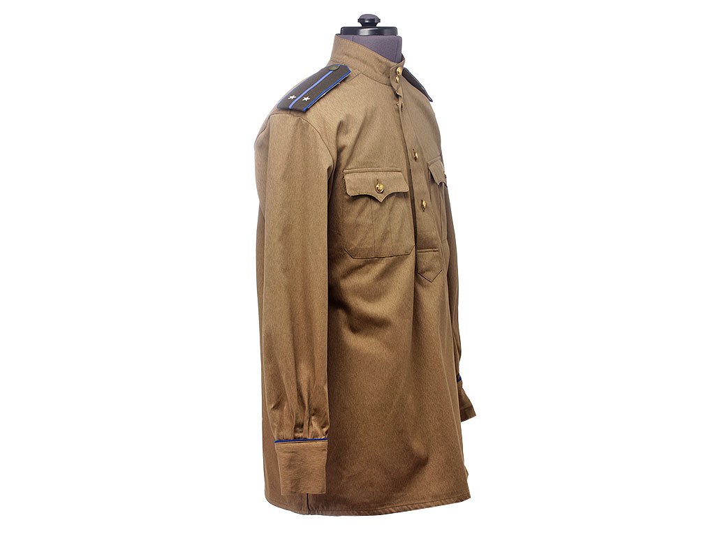 Гимнастерка с мягким стоячим воротником, застегивающимся на две форменные пуговицы малого размера. Передний разрез гимнастерки прикрыт планкой и имеет открытую застежку на трех малых форменных пуговицах. На груди два накладных кармана с трехмысковыми клапанами и бантовой складкой, с застёжкой на одну малую форменную пуговицу.