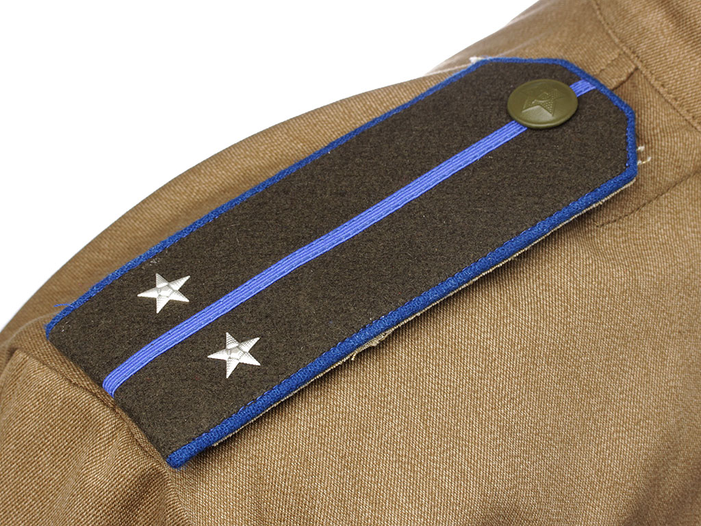 Погоны матерчатые, пятиугольные, с васильковым кантом и просветом, с двумя звездочками.