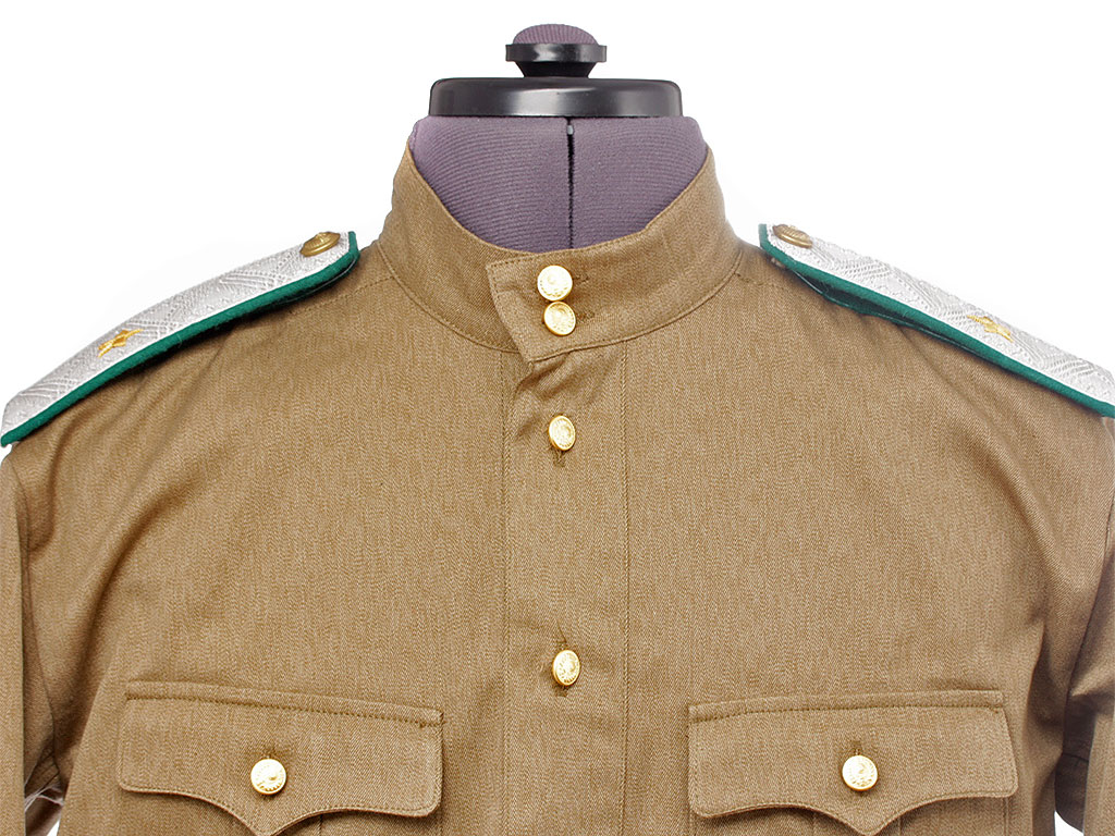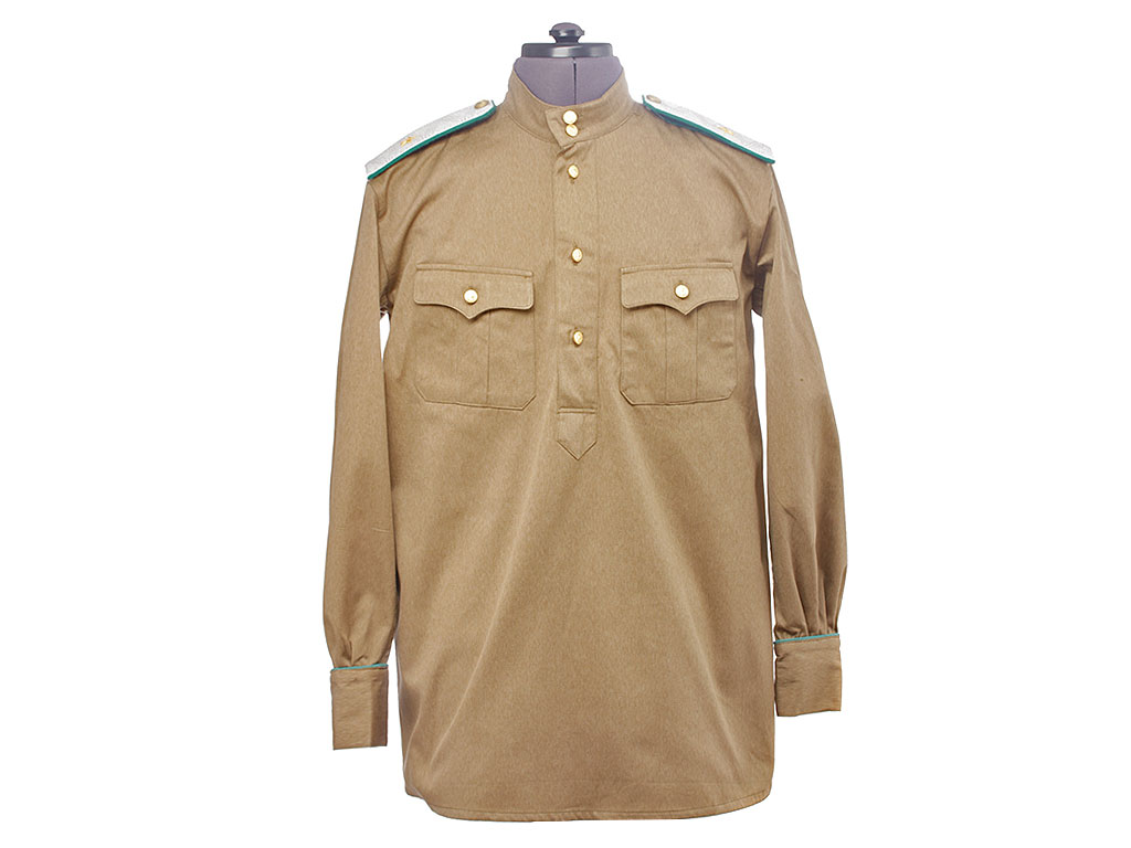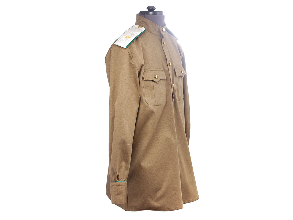 Гимнастерка с мягким стоячим воротником, застегивающимся на две форменные пуговицы малого размера. Передний разрез гимнастерки прикрыт планкой и имеет открытую застежку на трех малых форменных пуговицах. На груди два накладных кармана с трехмысковыми клапанами и бантовой складкой, с застёжкой на одну малую форменную пуговицу.