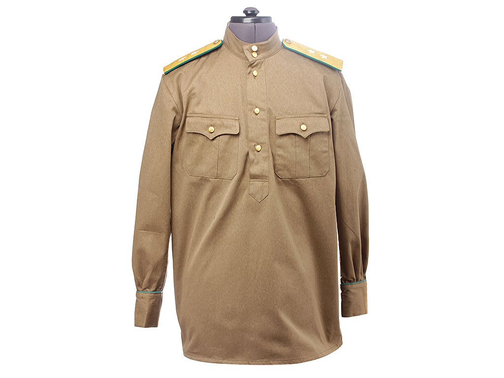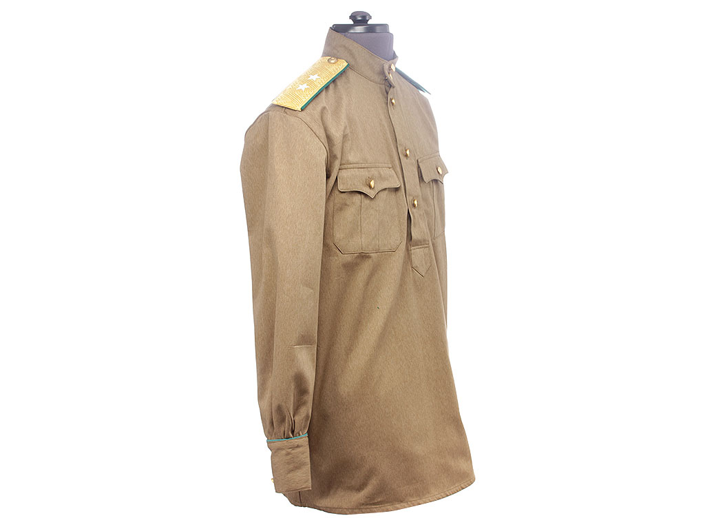 Гимнастерка с мягким стоячим воротником, застегивающимся на две форменные пуговицы малого размера. Передний разрез гимнастерки прикрыт планкой и имеет открытую застежку на трех малых форменных пуговицах. На груди два накладных кармана с трехмысковыми клапанами и бантовой складкой, с застёжкой на одну малую форменную пуговицу.
