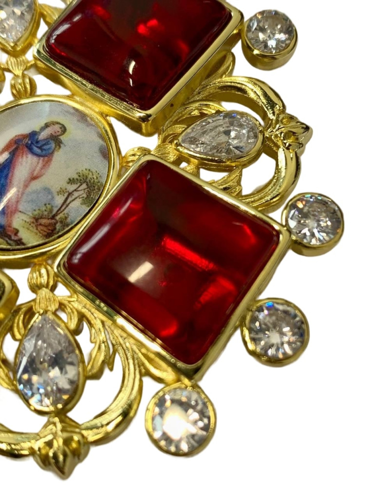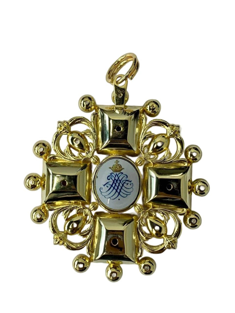 Высококачественная копия знака (крест 2-го типа) ордена Святой Анны первого класса, украшенного алмазами/бриллиантами, периода конца XVIII – начала ХIХ веков. Размер 75 на 80 мм (с ушком), вес с промзвеном около 87 грамм, изготовлен из ювелирного сплава, выполнено золочение и серебрение (оправа камней), имитация двенадцати бриллиантов округлой (диаметр 5 мм) и четырех каплевидной «груша» (6 х 10 мм) формы из белого стекла, все четыре луча креста выполнены с использованием красного полированного стекла. Центральный медальон аверса и реверса выполнен финифтью. Носился знак в узле орденской шелковой муаровой ленты, шириной 100 мм через левое плечо совместно со звездой ордена, носимой на правой стороне мундира.