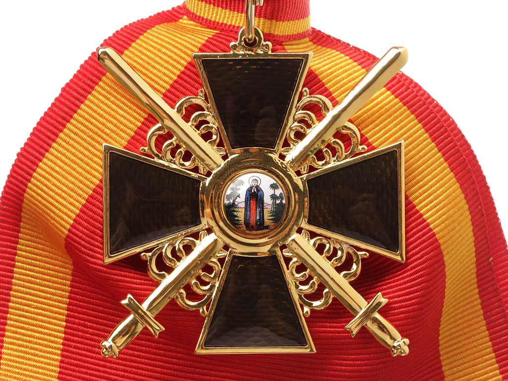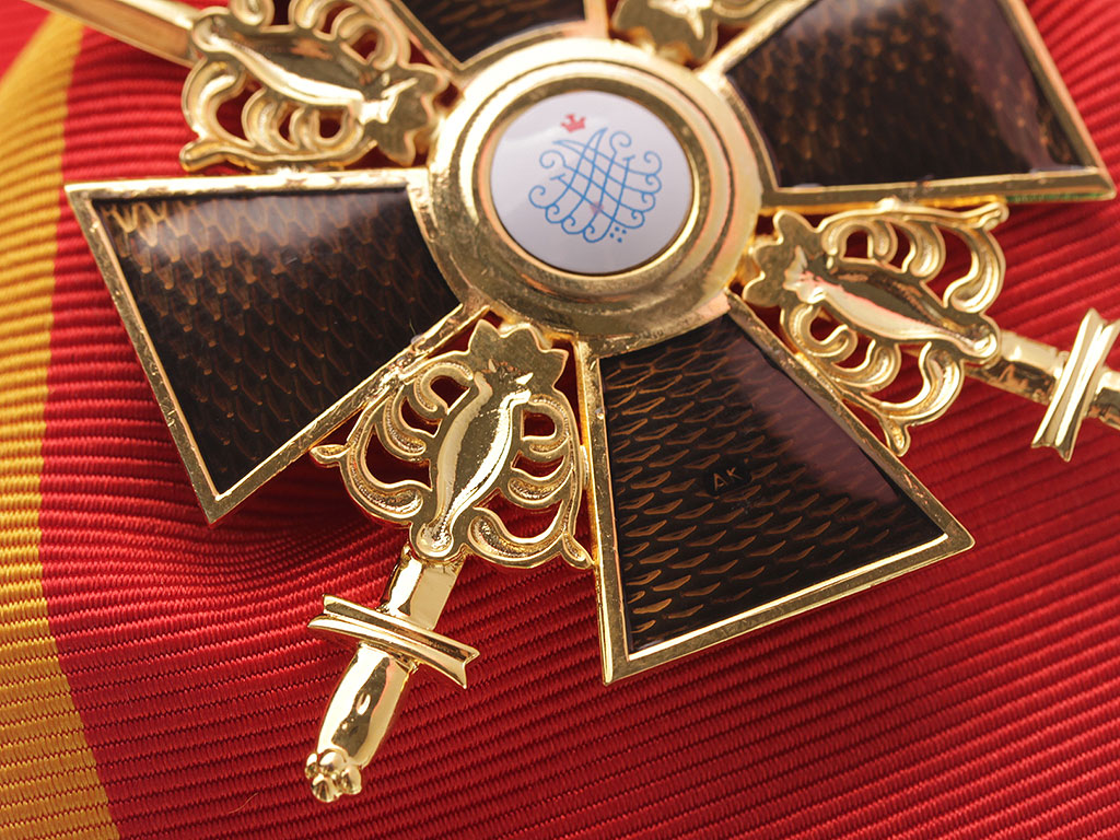 Орден Святой Анны 1-й степени с мечами - высшая степень ордена Святой Анны, носившаяся на плечевой широкой орденской ленте. Представленный орден - с черной эмалью вместо установленной Статутом ордена красной. Большинство исследователей сходятся во мнении, что появление орденов с черной эмалью - дань моде того времени: пик популярности таких орденов приходится на 1860-е годы и затрагивает практически все русские ордена, кроме ордена Св.Георгия. Подобные знаки орденов не являлись капитульными, они заказывались владельцами за свой счет.