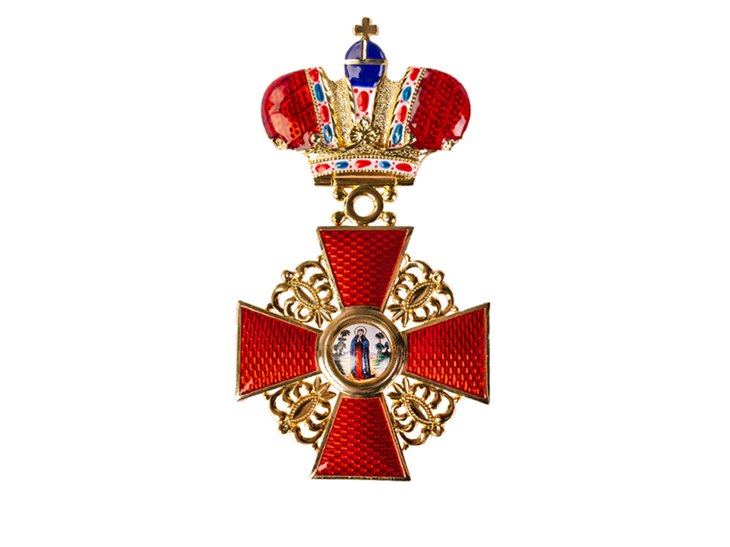 a. Крест, подобный установленному для первой степени, но меньшей величины, украшенный Императорскою короною; носится на шее, на ленте в один вершок шириною.