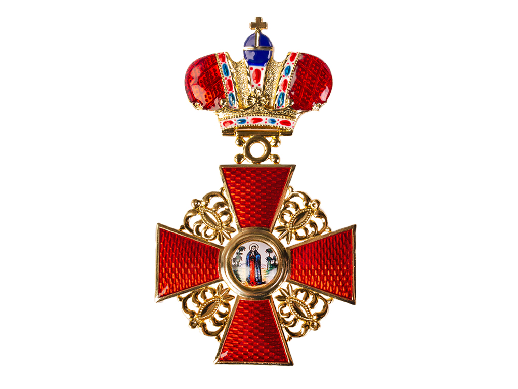 a. Крест, подобный установленному для первой степени, но меньшей величины, украшенный Императорскою короною; носится на шее, на ленте в один вершок шириною.