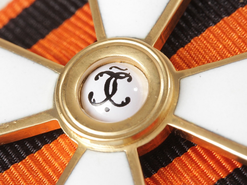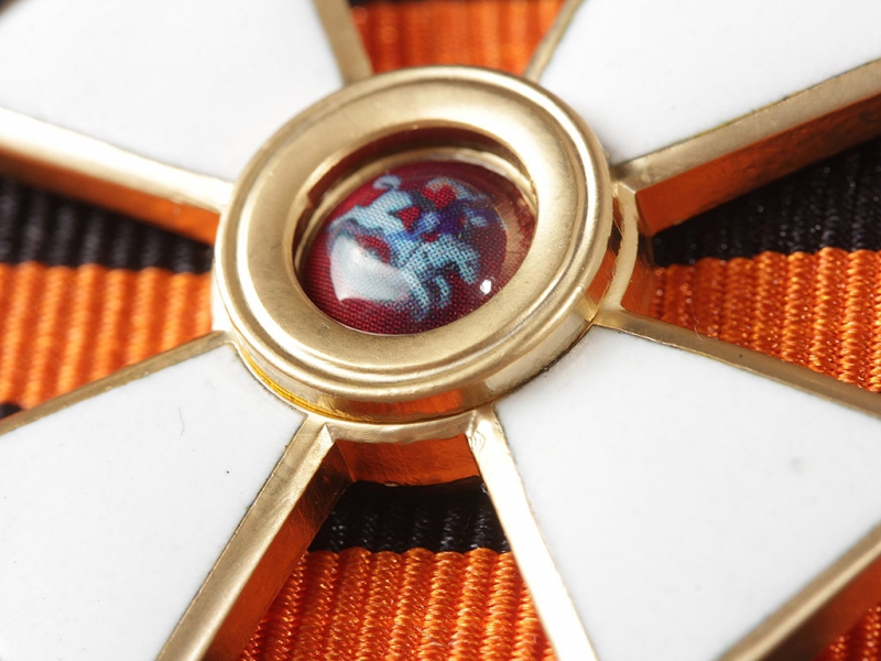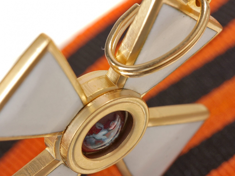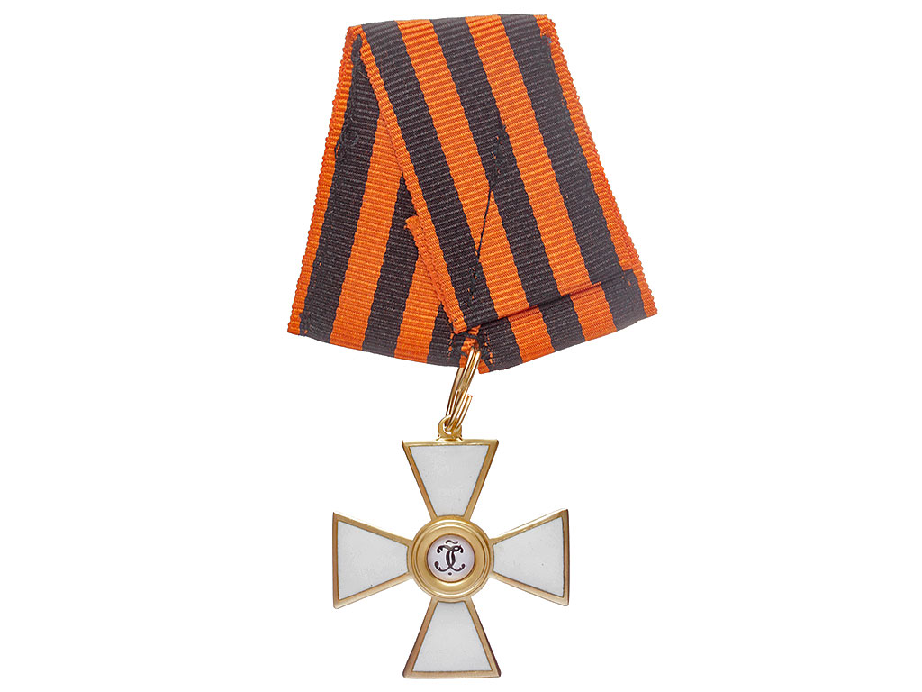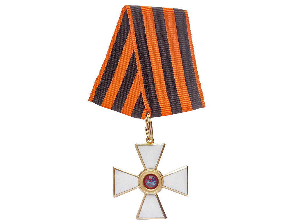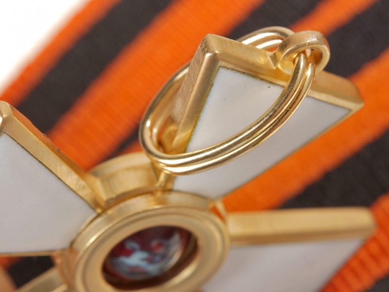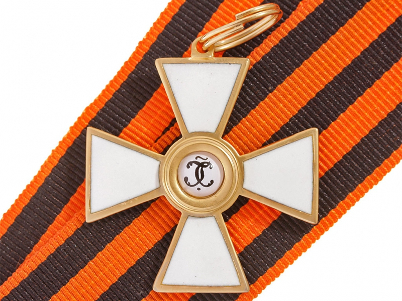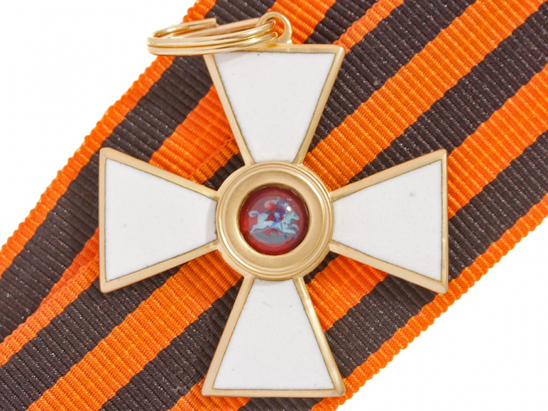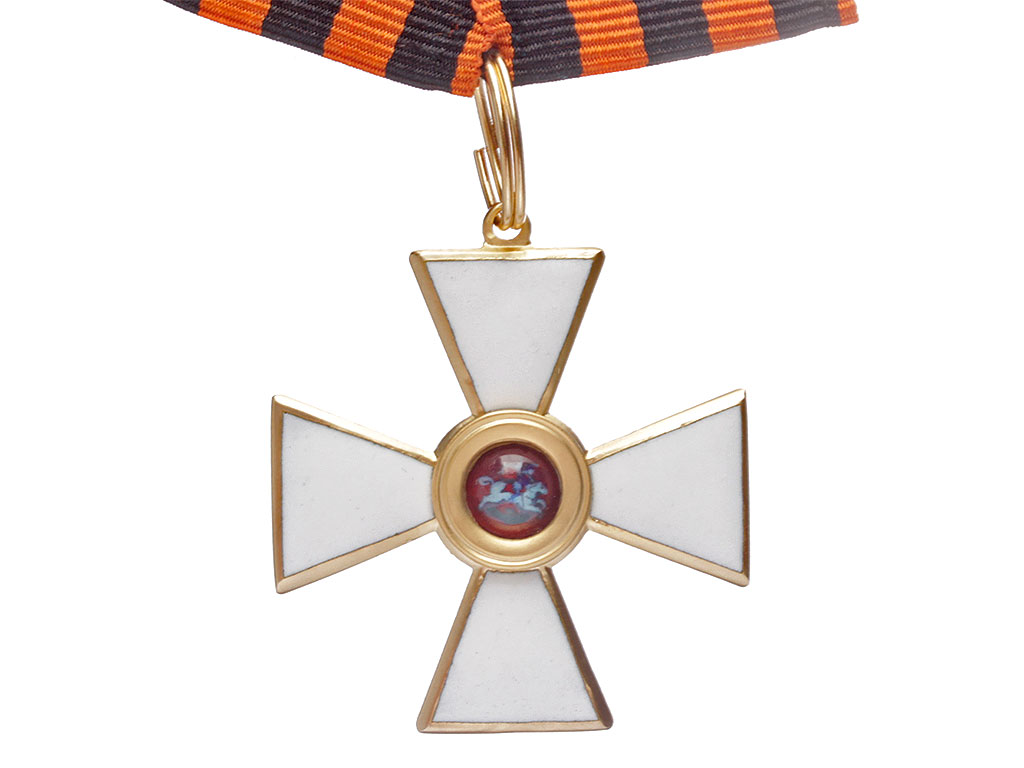 Орден Святого Георгия четвертой степени офицерский. Качественная копия, изготовленная по образцу бронзового капитульного Георгиевского креста. Данный вариант получил распространение с 1915 года - большинство награжденных офицеров заказывали себе именно такие кресты, так как он стоил значительно дешевле золотого (офицеры, в отличие от нижних чинов, заказывали и оплачивали свой орден из собственных средств). Колодка изготовлена из ленты и входит с стоимость лота. Ношение на шитой матерчатой ленточной колодке - достаточно распространенный способ ношения в то время. Металлические колодки, как правило, заказывались частным способом.