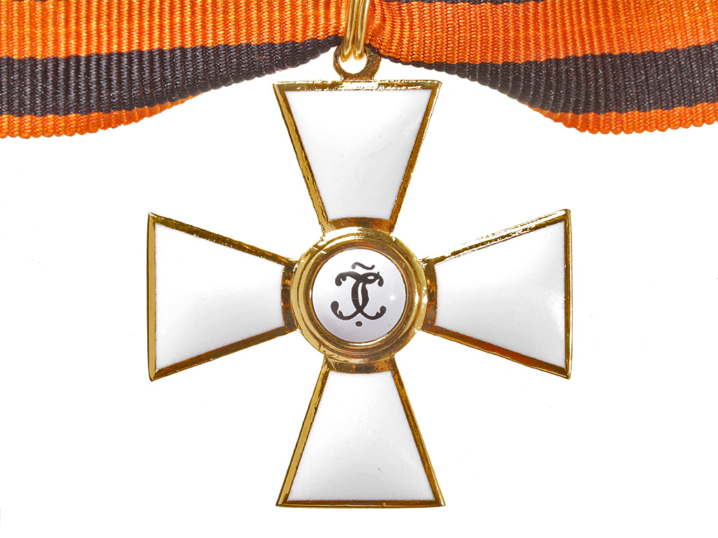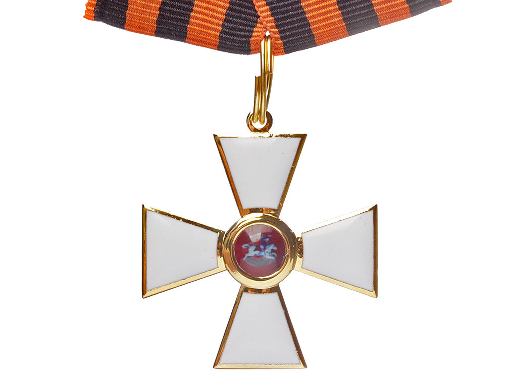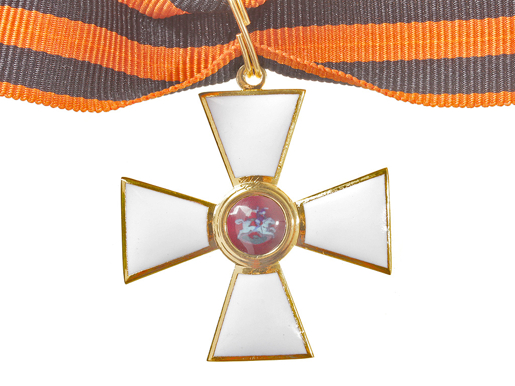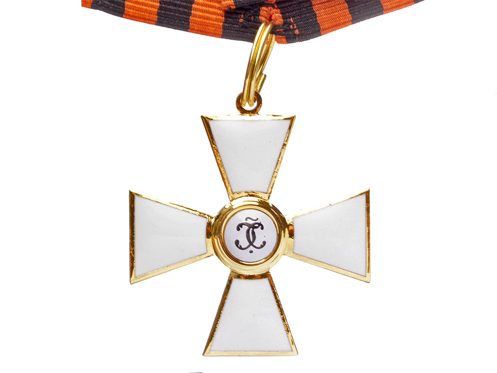 Орден Святого Георгия 4 степени офицерский. Образцом для изготовления копии послужил золотой капитульный крест - данный вариант был распространен с 1870 по 1917 год, капитульные бронзовые кресты появляются только в 1915 году. Колодка изготовлена из ленты и входит с стоимость лота. Ношение на ленточной матерчатой колодке - наиболее распространенный способ ношения. Металлические колодки, как правило, заказывались частным способом.