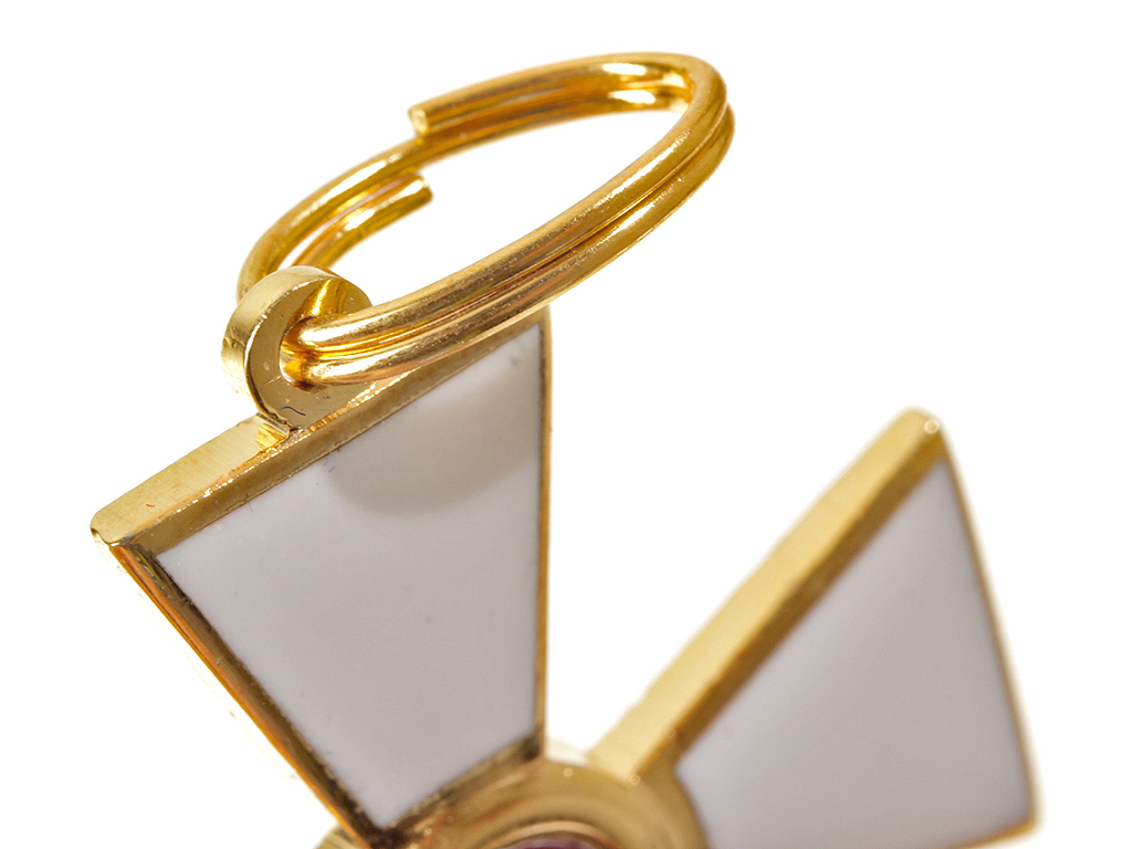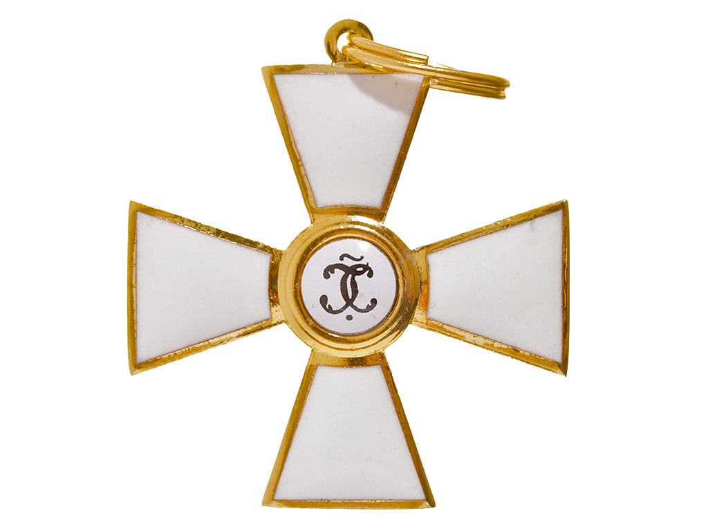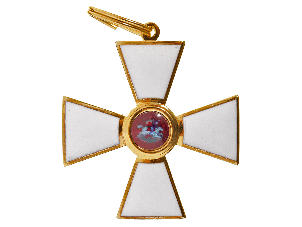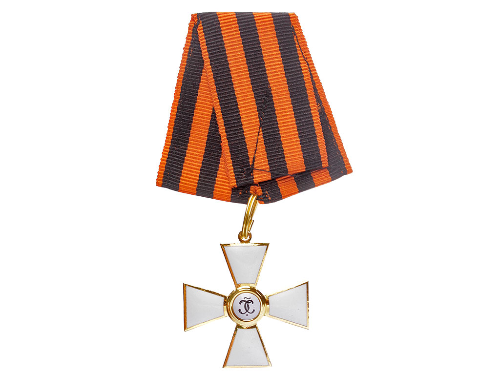 Орден Святого Георгия 4 степени офицерский. Образцом для изготовления копии послужил золотой капитульный крест - данный вариант был распространен с 1870 по 1917 год, капитульные бронзовые кресты появляются только в 1915 году. Колодка изготовлена из ленты и входит с стоимость лота. Ношение на ленточной матерчатой колодке - наиболее распространенный способ ношения. Металлические колодки, как правило, заказывались частным способом.