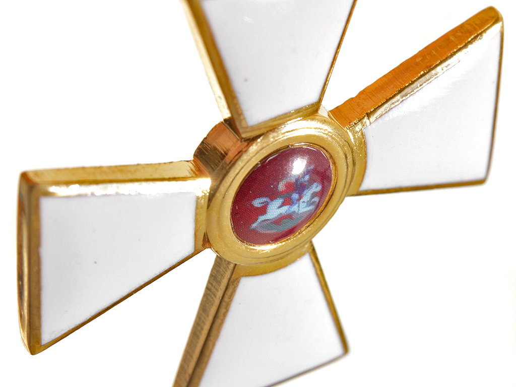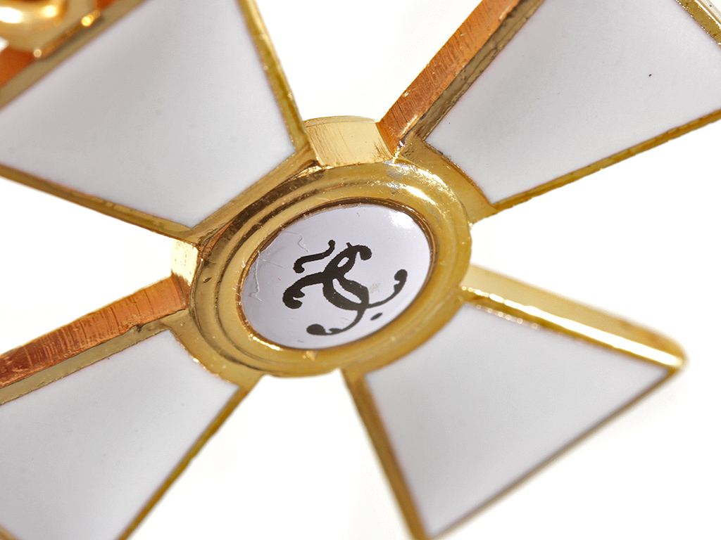 Изготовлен из латуни, позолочен. Выпуклая холодная эмаль. Копия очень высокого качества.