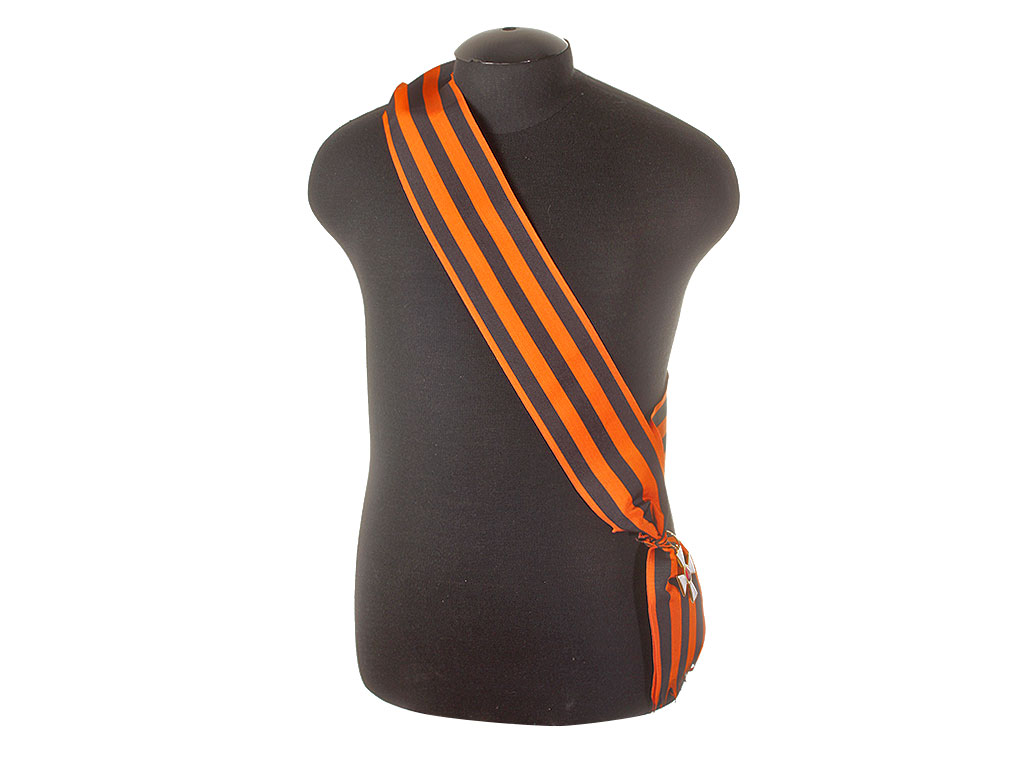 В комплекте плечевая георгиевская лента, отрез георгиевской ленточки для изготовления банта и колечко.