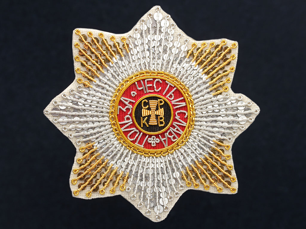 Шитая звезда ордена Святого Владимира. За образец при изготовлении копии взята подлинная звезда XIX века. Звезды всех российских орденов в XVIII - XIX веках зачастую были шитыми - они служили для повседневного ношения на мундире.