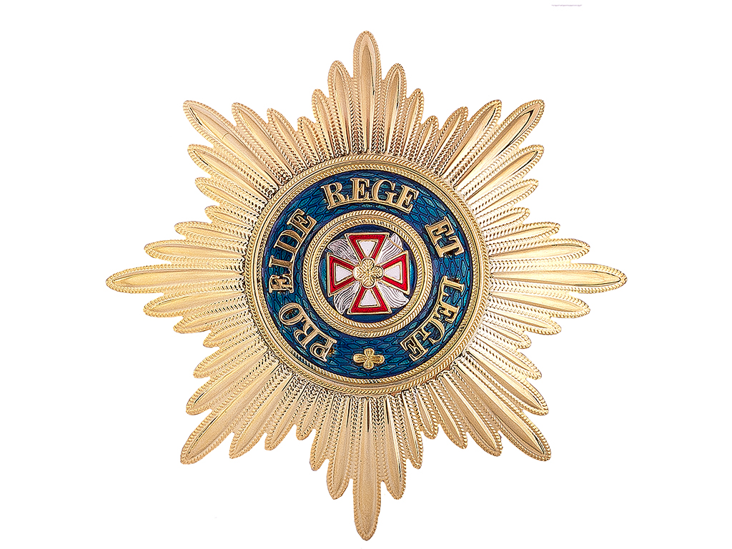 Звезда ордена Белого Орла – серебряная, восьмиконечная, в средине звезды изображен пламенистый крест, имеющий по краям три узенькие полоски, из коих средняя красная, а прочие две золотые; вокруг же него, на синей широкой полосе находится девиз: «Рго Fide, Rege et Lege (За Веру, Царя и Закон)».