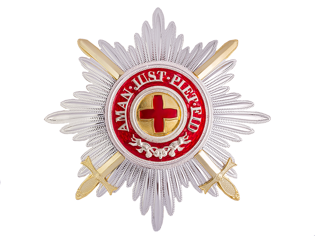 Звезда ордена — серебряная, восьмиконечная. Носилась на правой стороне груди. В центральном медальоне звезды, на золотистом поле — красный крест, вокруг него на красном эмалевом фоне — девиз.