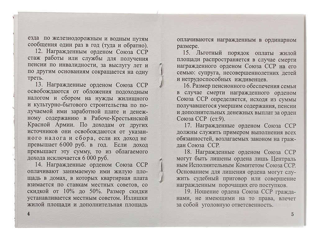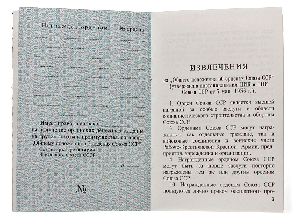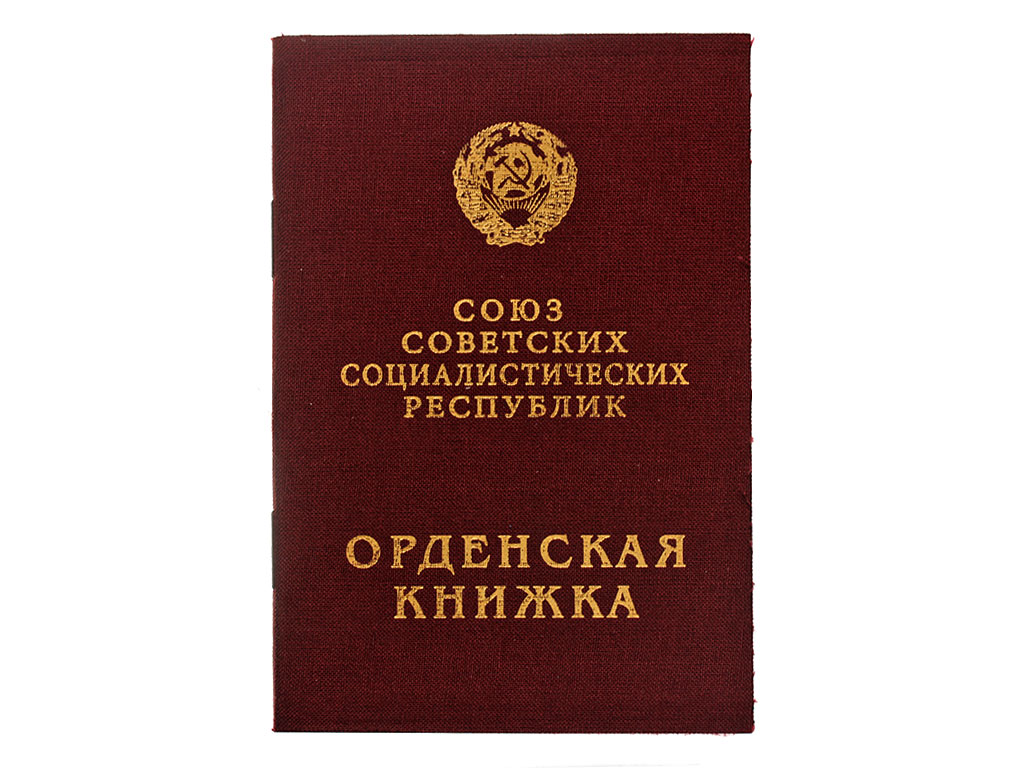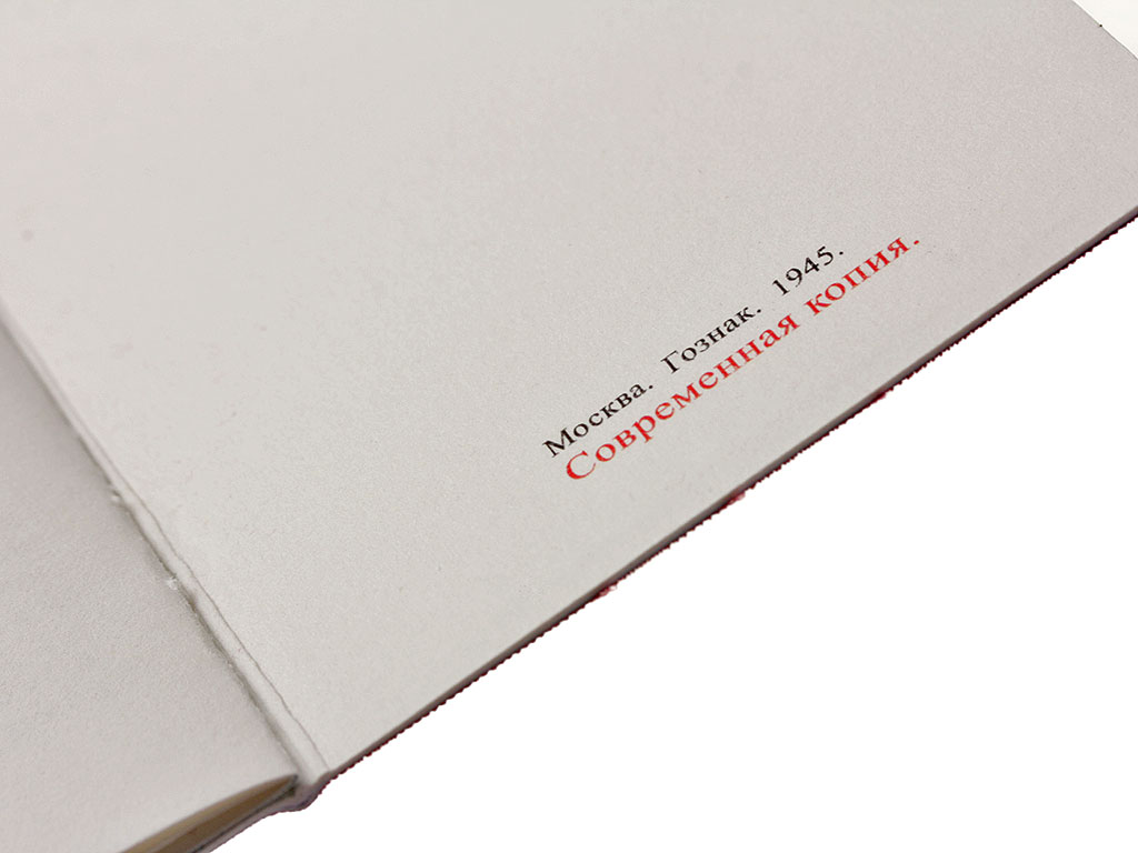 Исключительного качества копия Орденской книжки 3-го типа (вариант 1945 года), изготовленная типографским способом специально для кино, театральных постановок, музейной экспозиции, военно-исторических мероприятий.