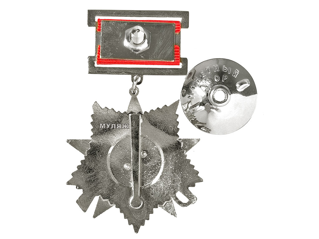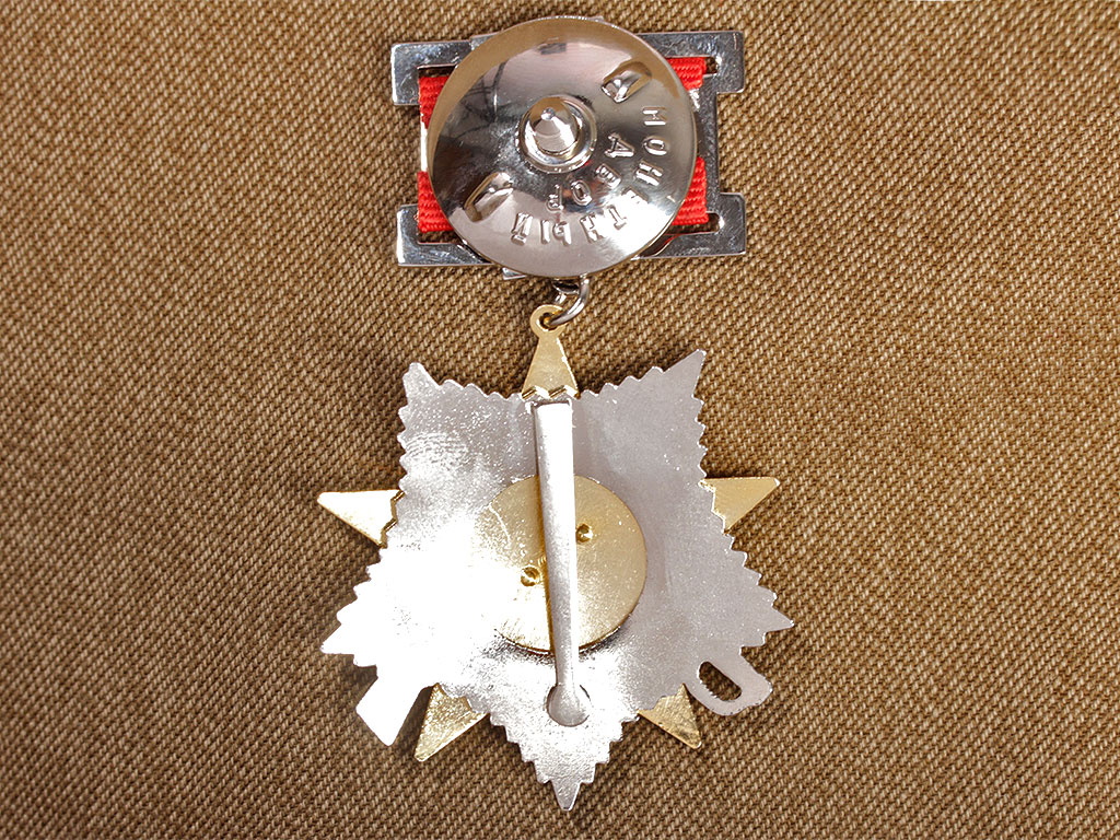 На оборотной стороне знак имеет нарезной штифт с гайкой для прикрепления ордена к одежде.
