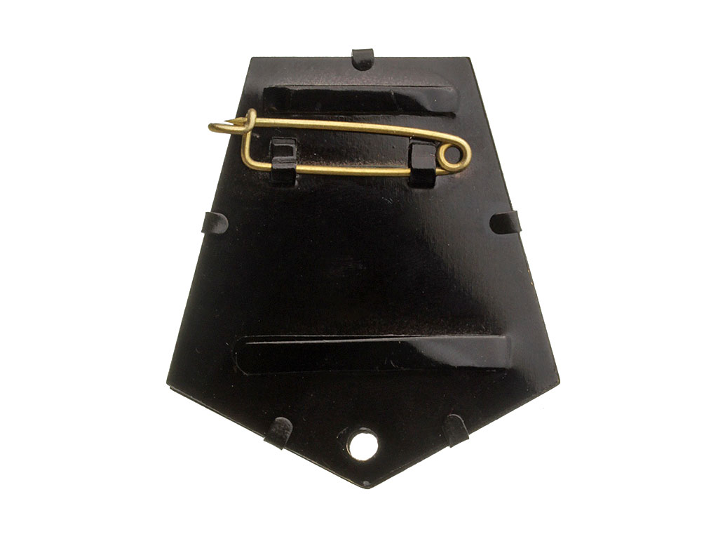 Среднего качества копия орденской колодки. Изготовлена из вороненого металла, двухслойная, с зацепами для орденской ленты и отверстием в нижней части для промзвена (колечка).