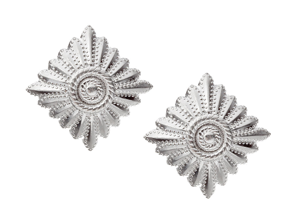 Пара серебряных четырехугольных рельефных звездочек уменьшенного размера (12 мм). Такие звезды, как правило, использовались в петлицах младшего командного состава войск СС (Waffen-SS), реже - на погонах унтер-офицеров Вермахта. Каждая звездочка имеет пару кляммеров (усов) для крепления.