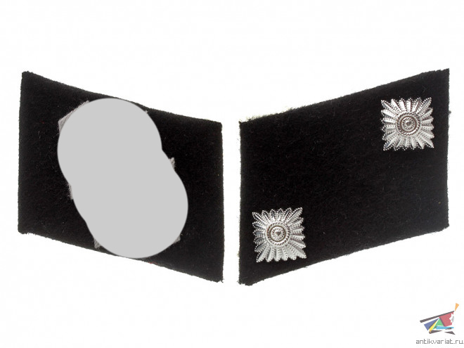 Пара петлиц обершарфюрера СС - полностью комплектные, с установленными на них знаками различия (двух ромбов, или звезд), установленных по диагонали петлицы. Копия хорошего качества, вышивка шелковой нитью.