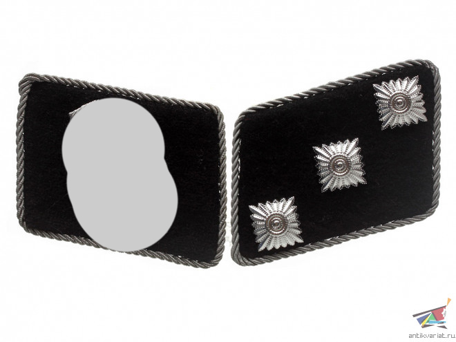 Пара петлиц унтерштурмфюрера СС - полностью комплектные, с установленными на них знаками различия (тремя ромбами, или звездами), установленными по диагонали петлицы. Копия хорошего качества, вышивка металлизированной нитью.
