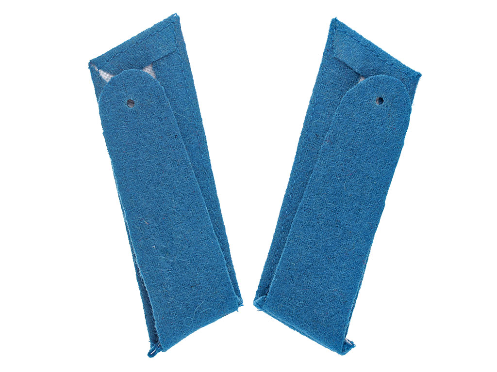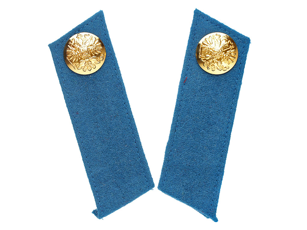 Качественная копия петлиц на шинель офицера Кирасирских полков Русской Императорской армии. Голубое суконное поле, голубой кант, позолоченные пуговицы с изображением Государственного герба.