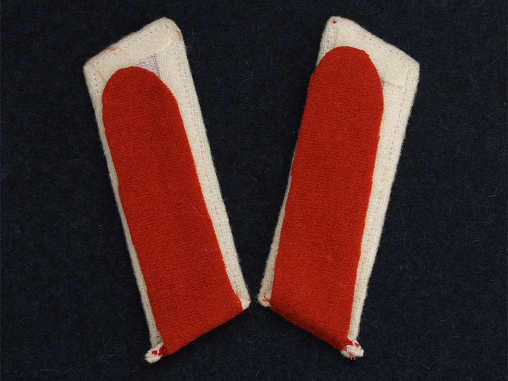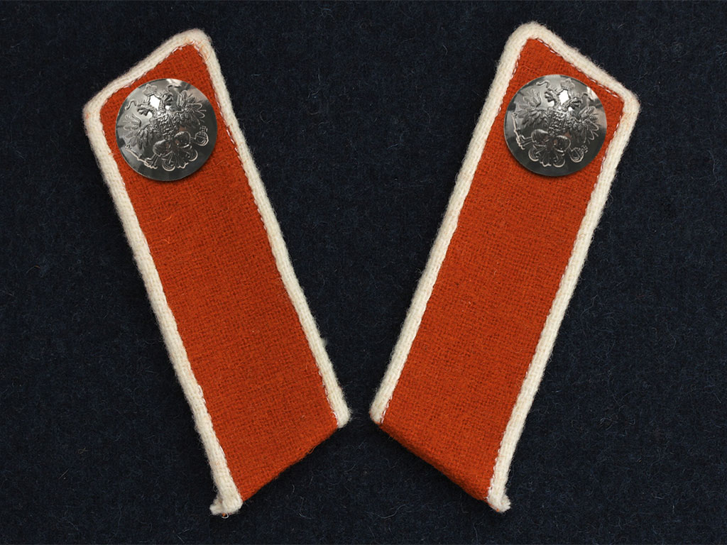 Качественная копия петлиц на шинель офицера 4-го драгунского Новотроицко-Екатеринославского полка. Оранжевое суконное поле, белый кант, посеребренные пуговицы с изображением Государственного герба.