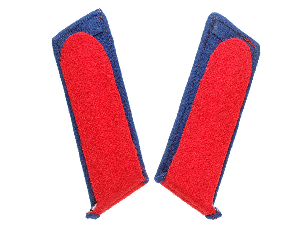 Качественная копия петлиц на шинель офицера 5-го уланского Литовского полка. Красное суконное поле, темно-синий кант, серебряные пуговицы с изображением Государственного герба.