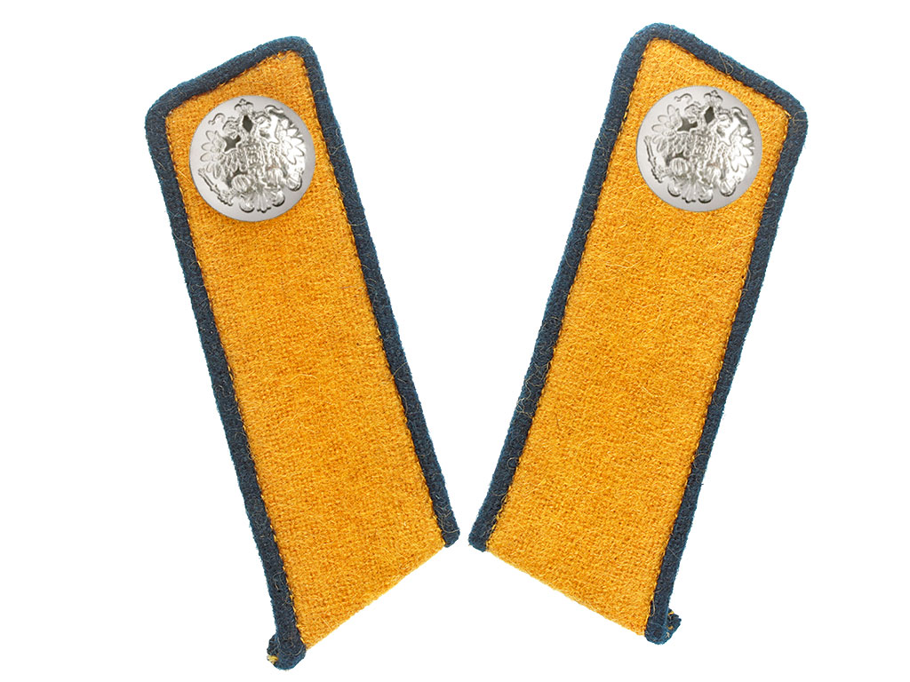 Качественная копия петлиц на шинель офицера 7-го Кинбурнского драгунского полка. Желтое суконное поле, темно-зеленый (государева цвета) кант, посеребренные пуговицы с изображением Государственного герба.