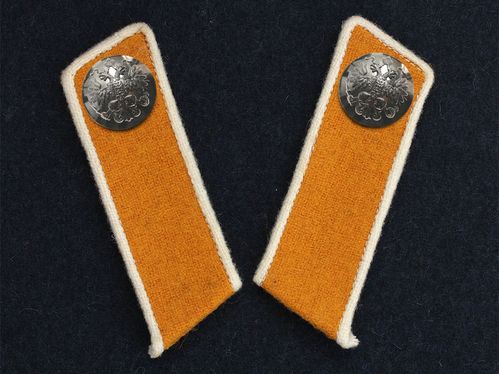 Качественная копия петлиц на шинель офицера 8-го драгунского Астраханского полка. Желтое суконное поле, белый кант, посеребренные пуговицы с изображением Государственного герба.